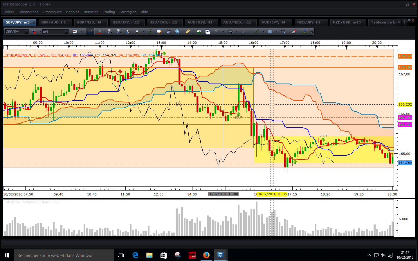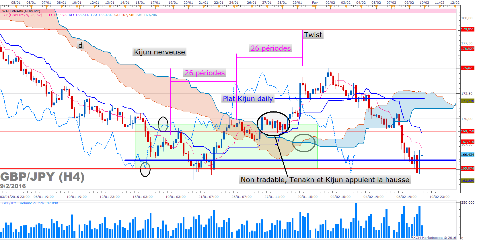 Mais ce qui caractérise le plus un range, c'est que la SSB et la Kijun soient à plates. Il faut donc faire attention de ne pas voir des range systématique où il y a des twist, au risque de trader des ranges alors qu'il y a renversement de tendance. Voilà ce qui est un range "tradable" pour moi (bien qu'il ne soit pas le meilleur exemple ):