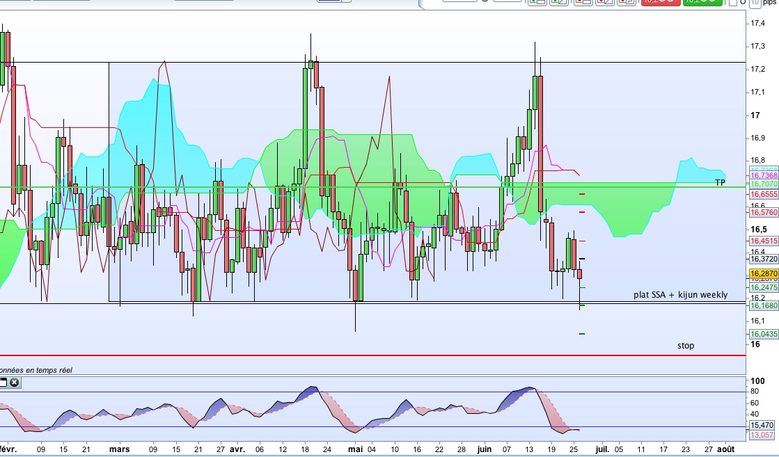 je detecte une range daily sur le silver avec un leger ressaut sur la borne basse, qui correspond à un plat SSA hebdo . Les prix sont très éloigné de kijun en daily, signe d'une forte survente. Les prix se sont confronté à un plat SSA aligné à kijun en hebdo, avec plusieurs chandeliers de retournement, mais sont malgrés tout allé chercher le bas du range. Mon plan, c'est d'attendre la clôture en H4 à 18h, et observer si il y a confirmation de l'englobante en cours pour entrer en position, si possible sous 16,2 afin de respecter mon ratio de 2/1. Je place mon stop à 15,95 sous la dernière mèche du range en cours en daily, que j'ai abaissé un peu plus pour ne pas être sur le chiffre rond de 16. Le TP est placé juste sous la ZE.