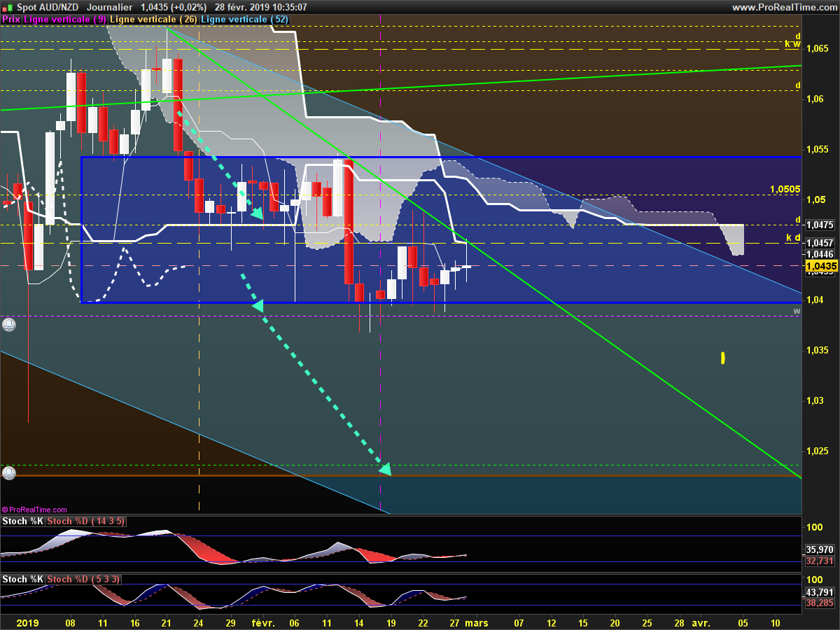 Bonjour, conformément au plan évoqué le 28/02, le range daily a cassé, la tenkan est proche des cours et la kijun va s'orienter à la baisse dès qu'on fera un nouveau plus bas (c'est-à-dire si les prix baissent encore de 5 pips)