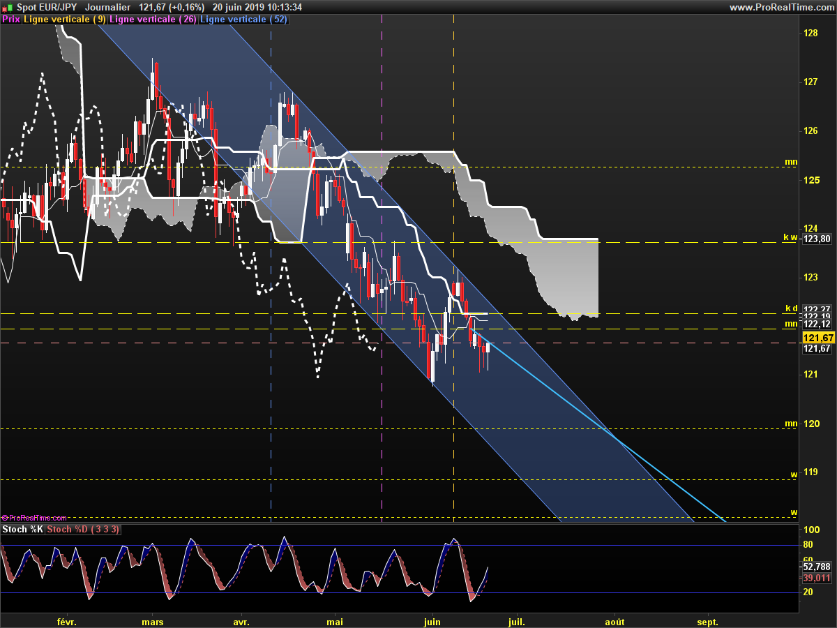Mon objectif c est la récession en Allemagne et les annonces de la BCE qui pourrait nous faire descendre à 110 et 95 dans les mois à venir,,,,oui le canal hebdo est puissant, le canal en daily est pas mal aussi, peut être si repasse sous kijun je shorterai selon le momemtum,,,je ne suis pas pressé mais encore une fois je shorte l euro sur beaucoup de paire,,