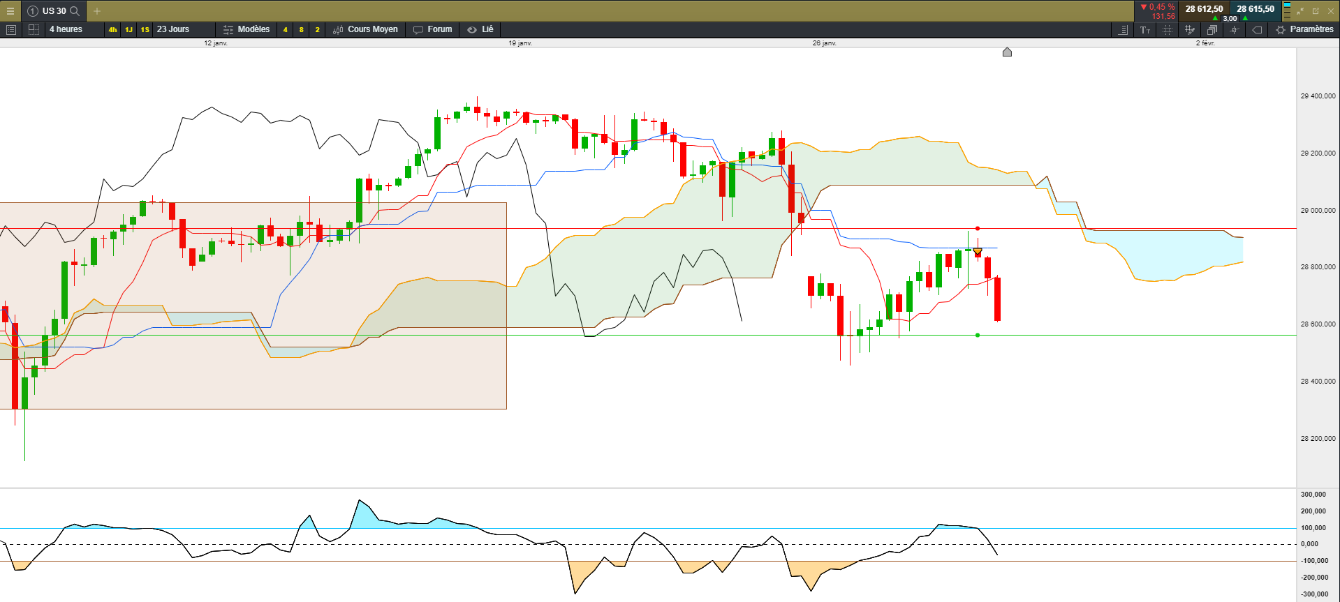 Perso je suis plus dans une phase baissière, je vais attendre la cassure du range M15 par le bas et viser le bas du range H4, vad a 28480 et TP à 28380 stop en fonction des bougies qui casseront le range, et peu être laisser filer le trade jusqu'à la kijun J à 28150.