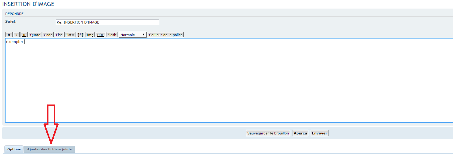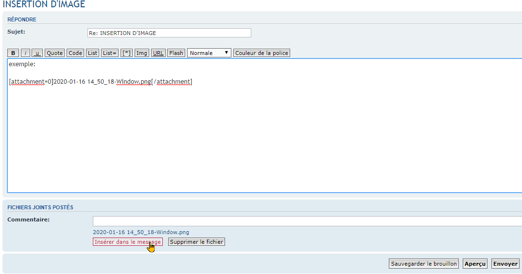 6- voici comment l'image apparaît (avec le nom du fichier". Enfin, quand vous publiez le message avec "envoyer", l"image apparaîtra comme vous le souhaitez