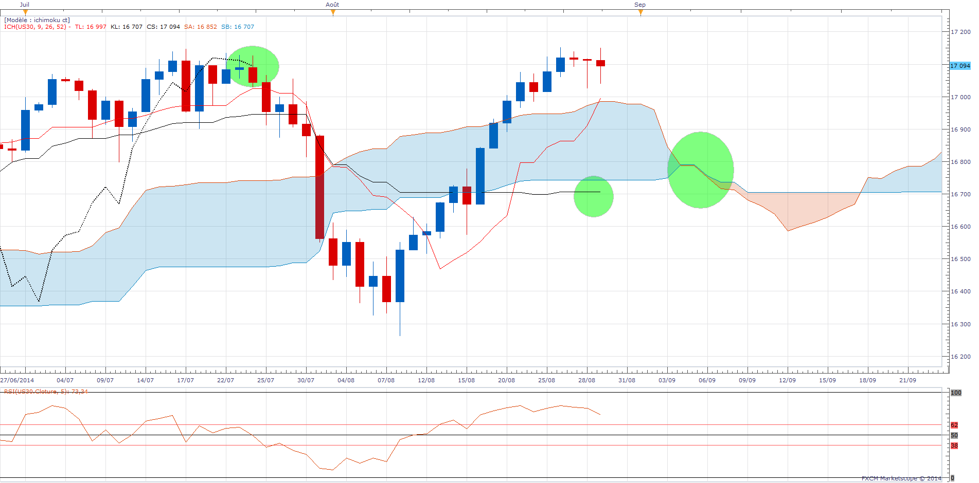 Un bemol : la presence de bougies fantomes sur le GER30 en H4 peut fausser la position des droites d'Ichimoku.