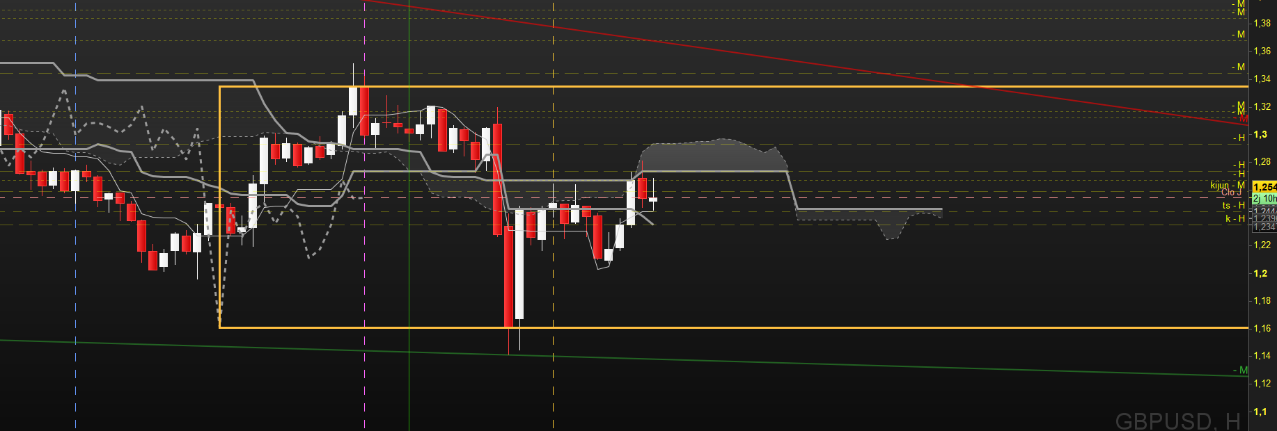 en mensuel, il est vrai que la tendance est baissière, mais ce n'est pas bien grave pour un trade en H4. En revanche, je vois que les prix testent la kijun qui semble les repousser (pour le moment) dans ce grand biseau baissier