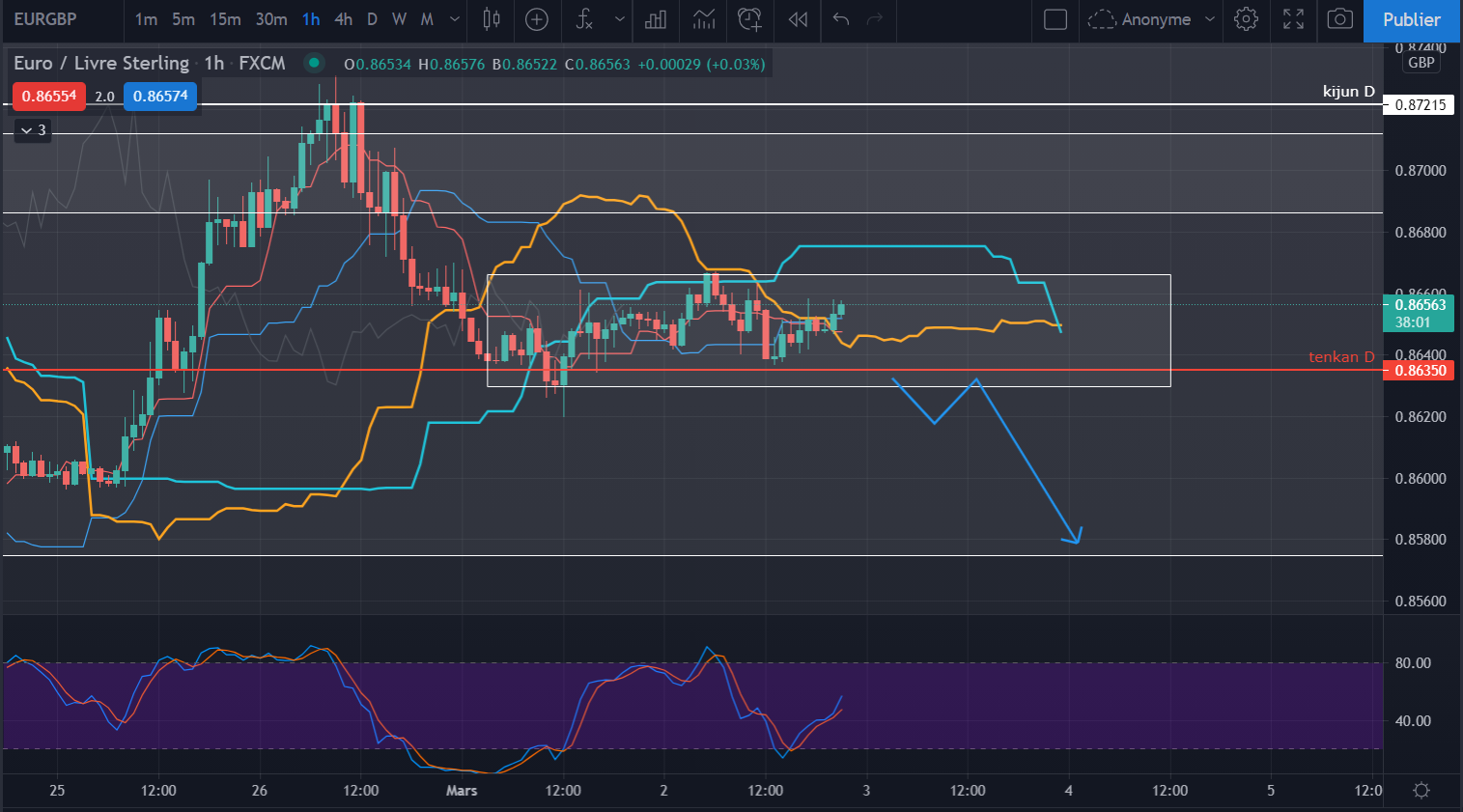 J'ai pu faire la même analyse sur le H1 avec le range qui c'est dessiné, cependant je me suis trompé en traçant la BB du range trop "haut" (cet exercice a l'air simple quand on voit les vidéos sur Ichimoku de Patrick mais dans la réalité beaucoup moins :lol: )