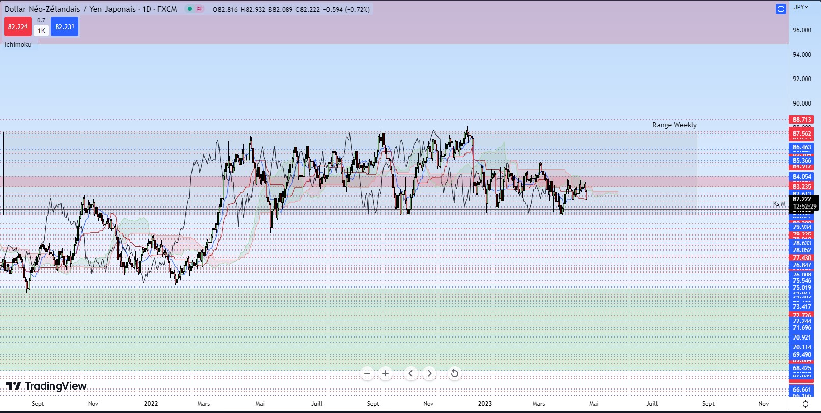Sur le weekly, le nuage est parfaitement à plat et traduit un range compris entre 87.7 (dont la borne haute est un plat SSB weekly) et 80.84 (dont la borne basse est une confluence de plat SSB mensuel et weekly).