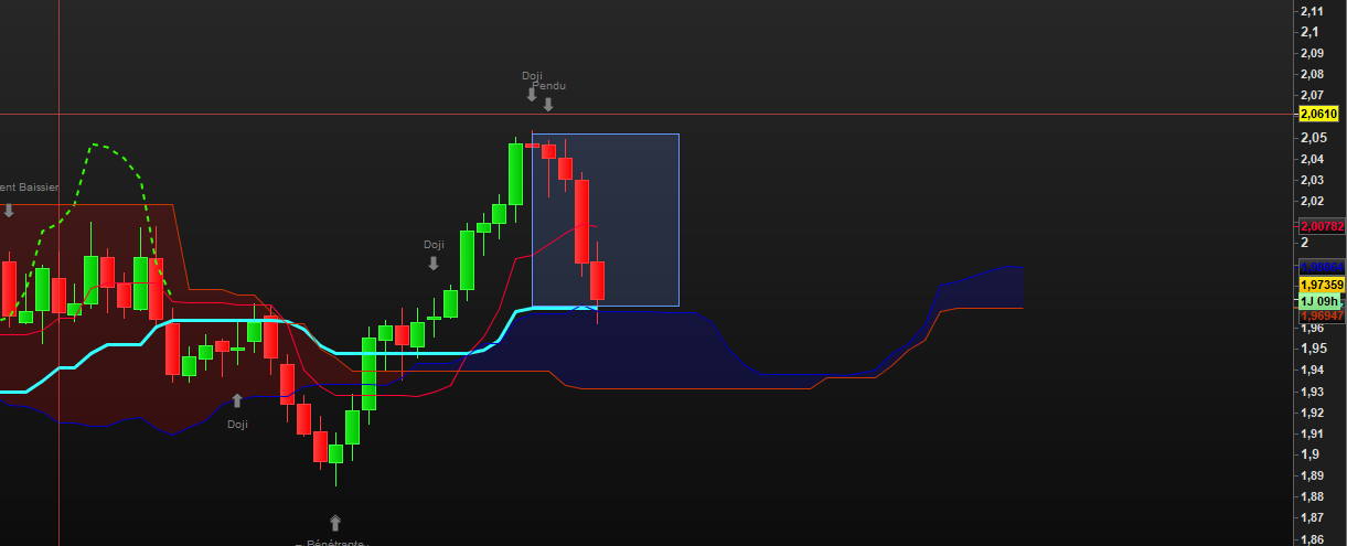 La ZE du range hebdomadaire correspond à un range journalier, qui a été cassé à la baisse, pull-back, prix repartent à la baisse. Les prix sont maintenant en tendance baissière, et en accélération depuis la Tenkan.