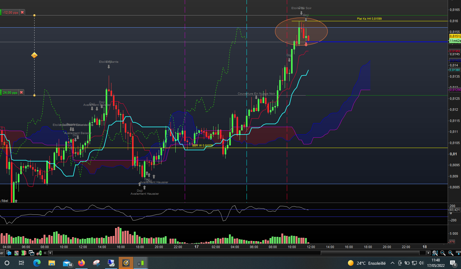 par conséquent, j'ai plus une vision haussière ici, mais en intraday, trader une réaction au contact de kijun H' peut s'envisager, mais en restant conscient que c'est contre le mouvement en cours. A la question "alors j'aurais dû acheter", je répondrais oui en daily (avec SL sous la mèche), mais non sur les UT inférieures car kijun H4 fait résistance et elle devra casser.