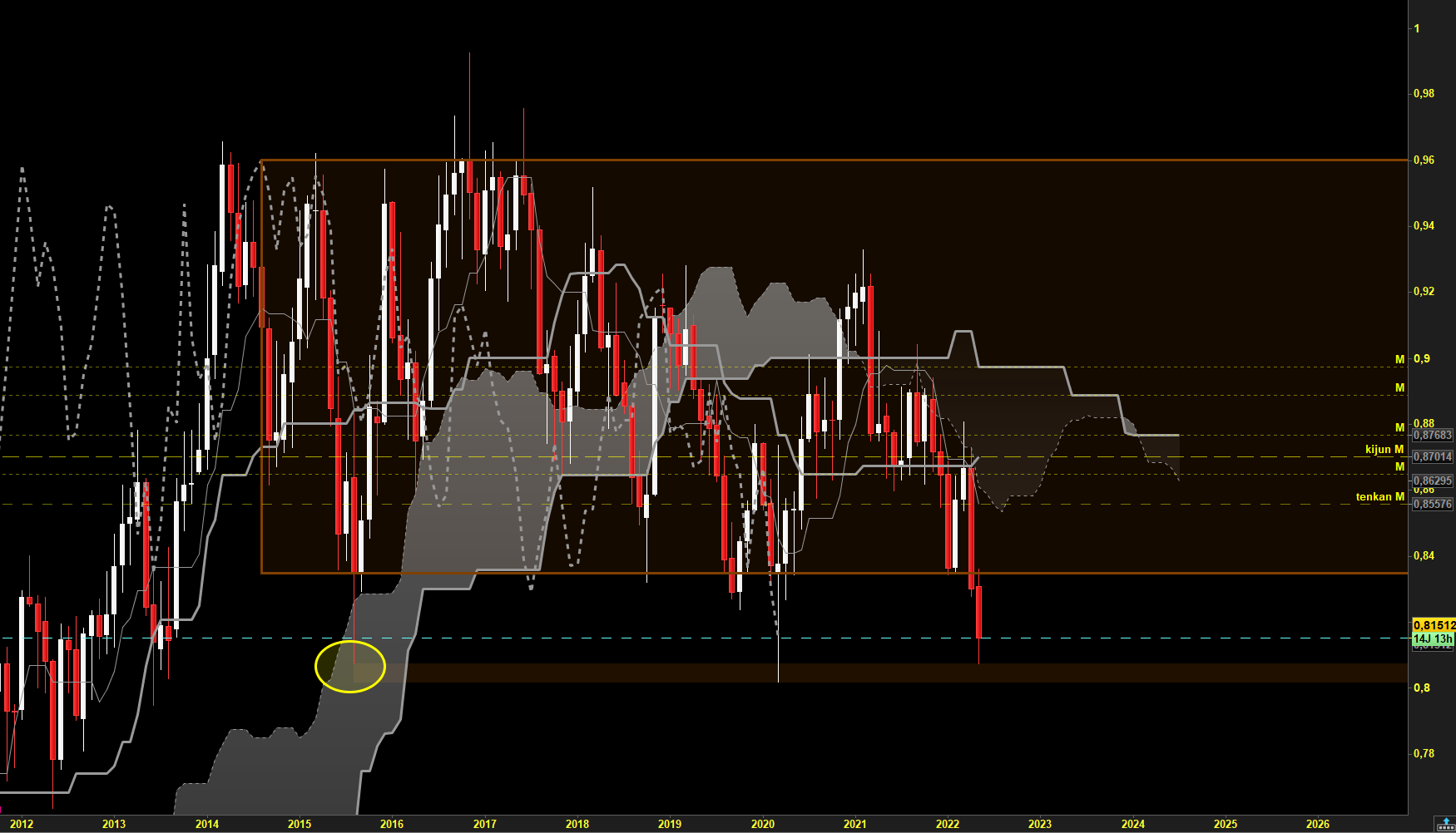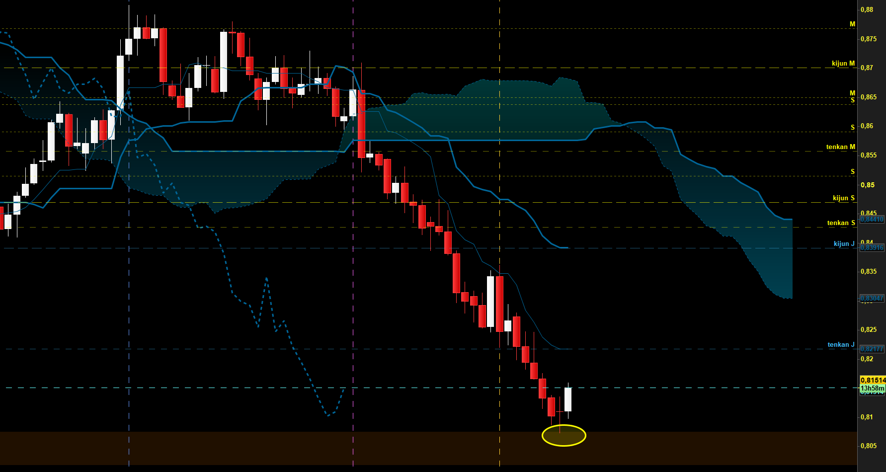 Conclusion : Tendance baissiere donc je recherche une vente avec un SL au dessus de la Kijun M15 et un obj à 0.8102 (BBR weekly). L'idée est de sécuriser à BE une fois les derniers plus bas atteint