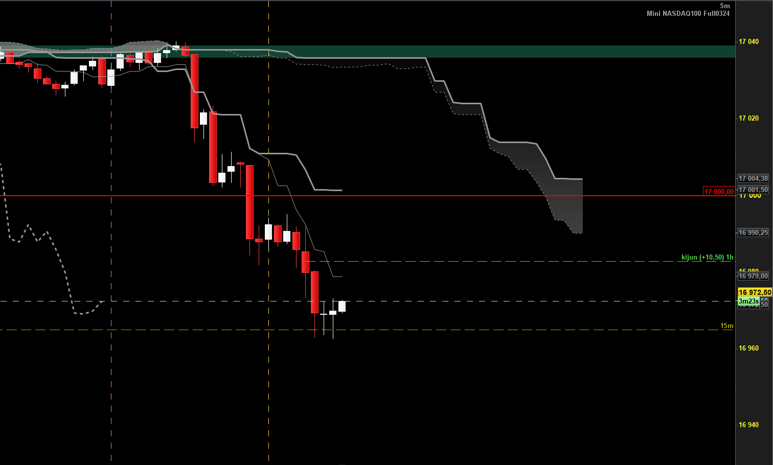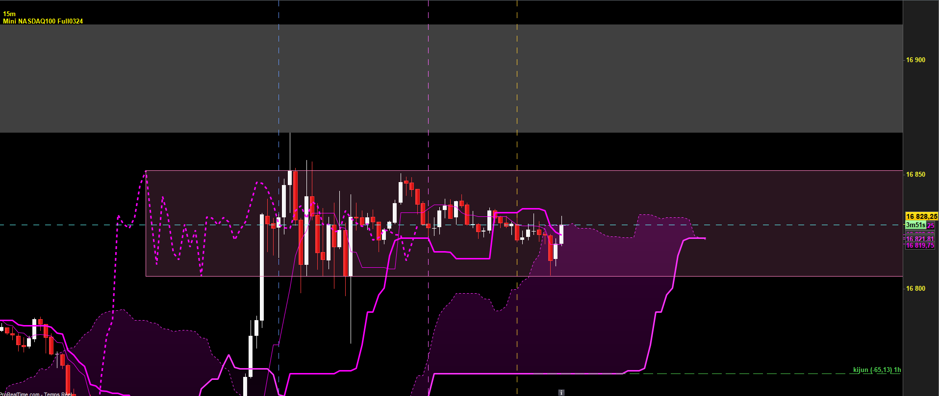 10h10: les prix sont dans ma zone grise, je vais surveiller un reverse alors que je n'ai pas respecté mon plan en vendant la superbe étoile filante m15 en haut du range m15 (trade perdu)