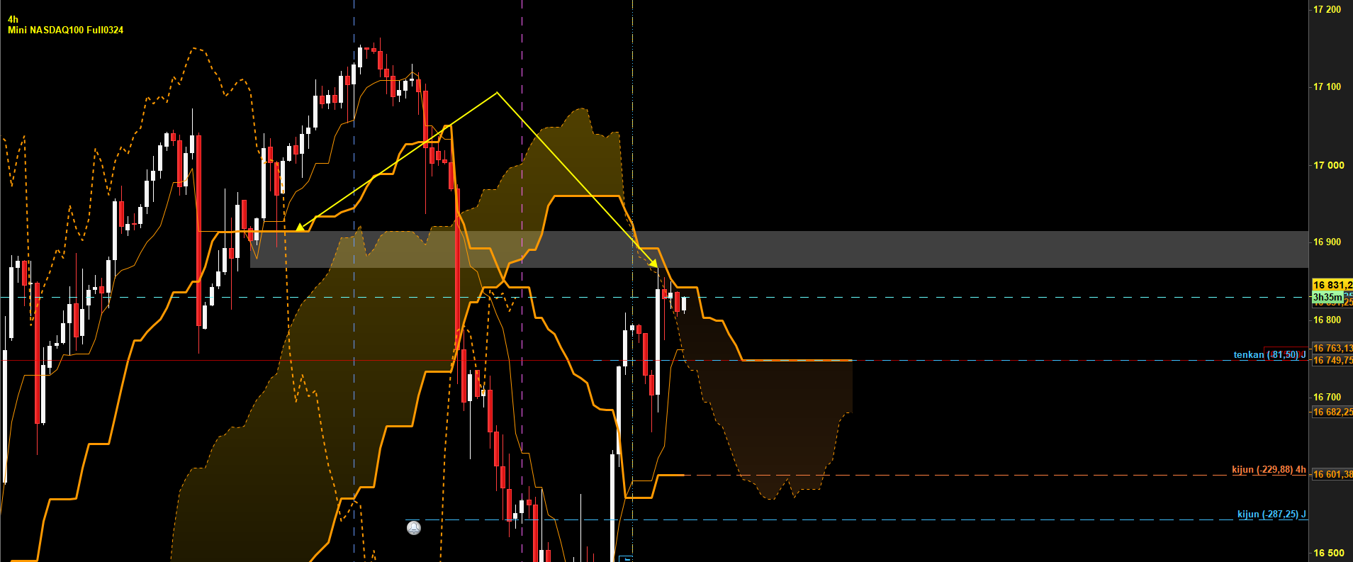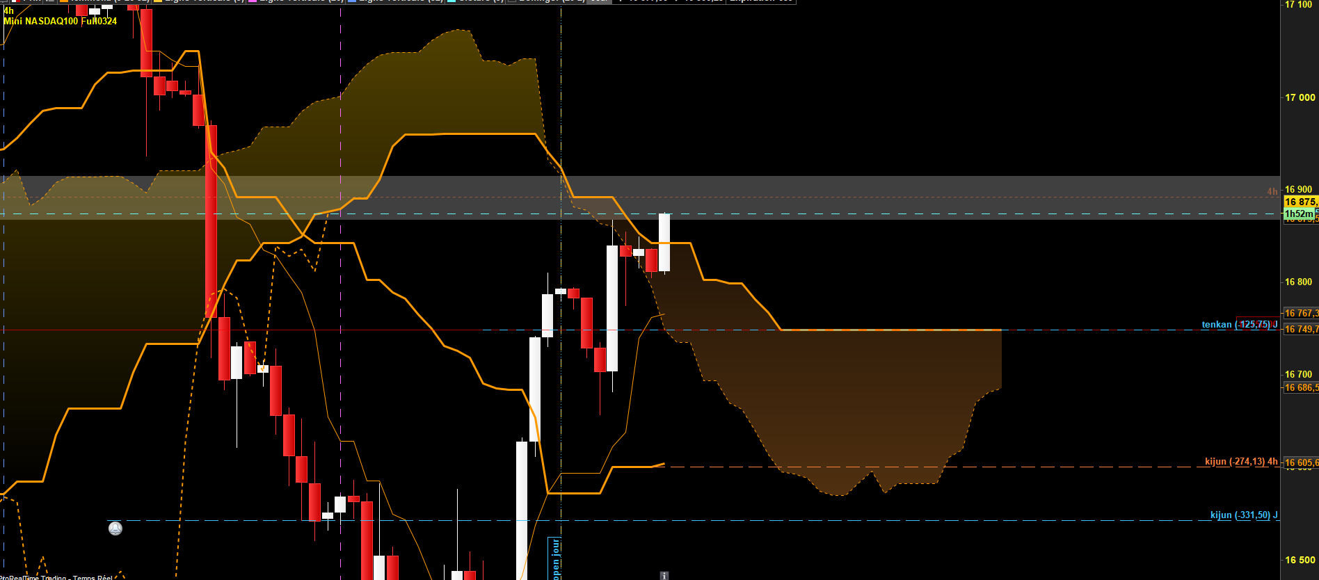 Bonjour, H4 en range, mais sous une zone de résistance Ichimoku (en rouge). Il y aura également une oblique à casser pour monter. J'ai donc tracé un triangle qui selon moi est une forte zone de Résistance.
