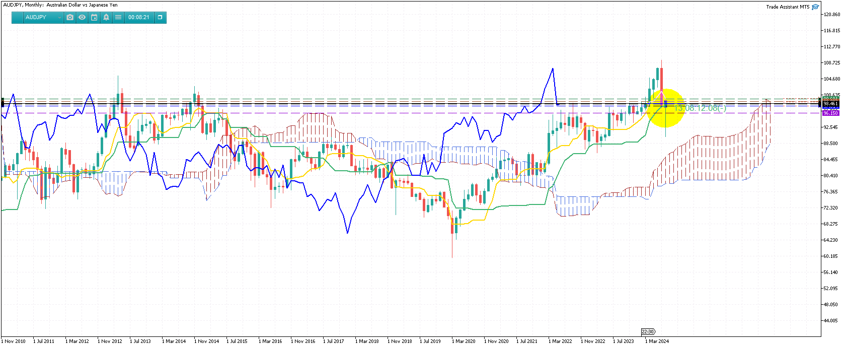 plan baissier si retracement vers la ZE, si cassure de la BHRhebdo, attendre un rebond en appui sur la kijun hebdo pour aller chercher les 100 en mensuel = 2 derniers plus hauts et chiffre rond