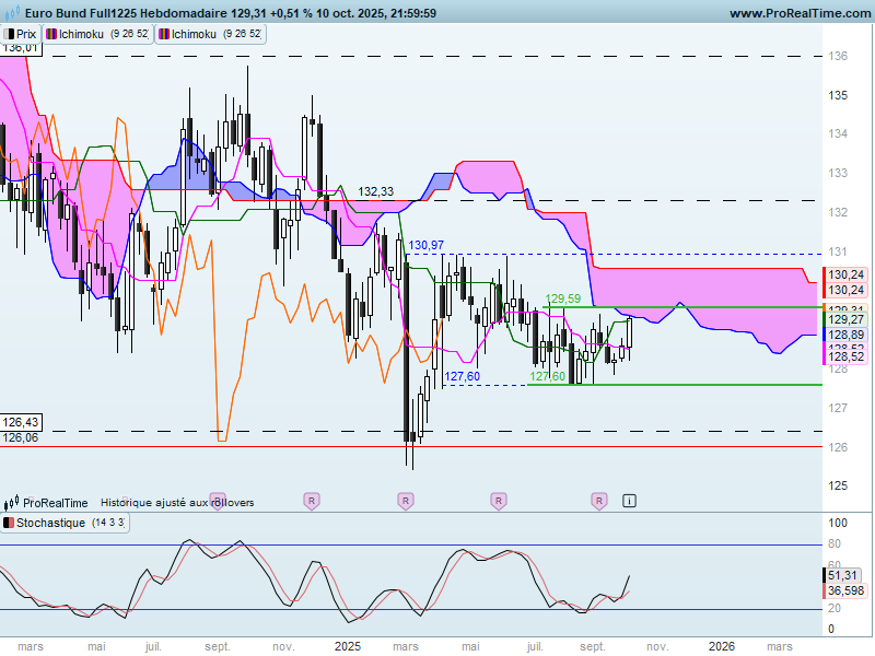 Le contrat Bund est maintenant sur l’échéance décembre 2025. Cela a eu pour conséquence de faire bouger les supports et résistances sur les unités de temps les plus longues (voir l’explication de la semaine dernière). Ainsi, les supports de long terme se situent dorénavant sur 126.01 et 126.43 alors que les résistances sont sur 136.01 et 145.13.