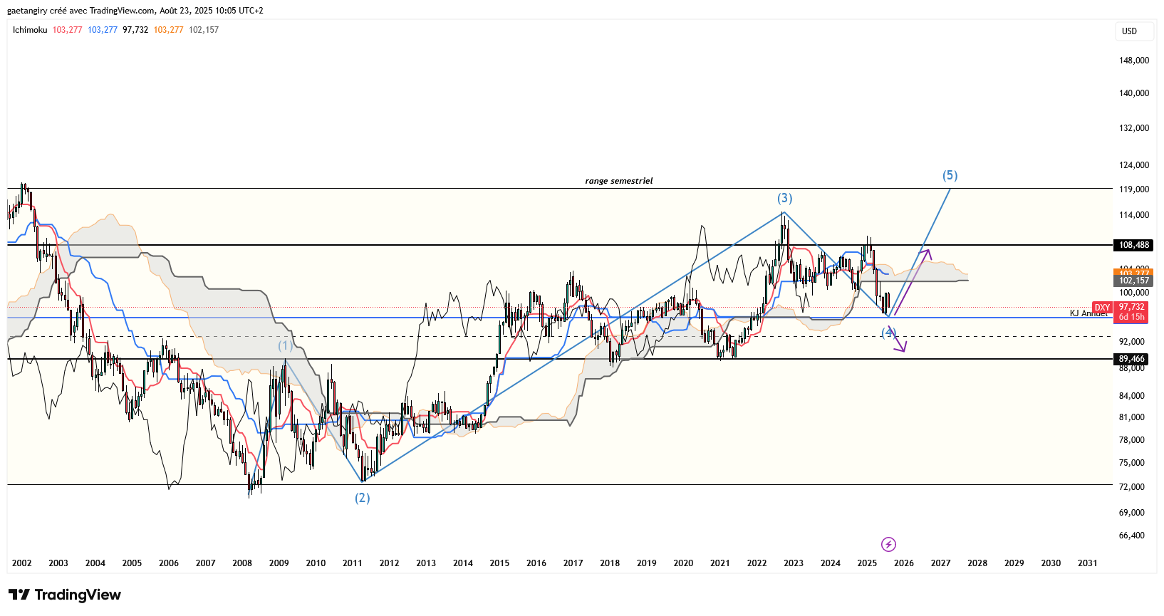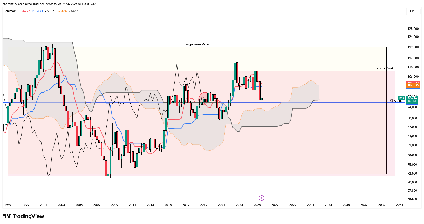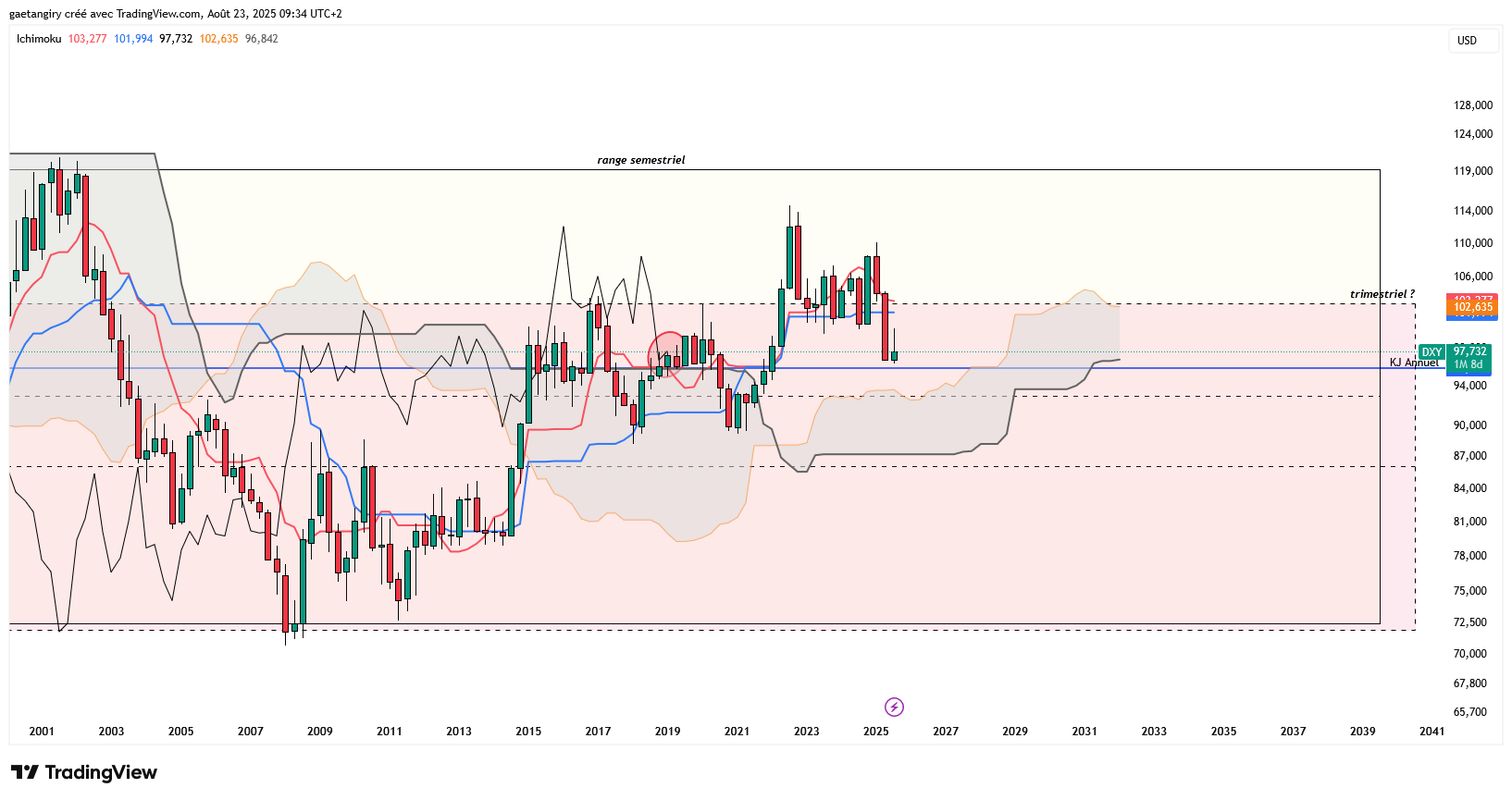 mon avis personnelle nous somme dans une tendance de fond haussière bien que depuis l'arrivé de Trump tous cela a fortement chuté il est possible que l'on reviennent sur la kijun annuel pour repartir chercher le haut du range semestriel
