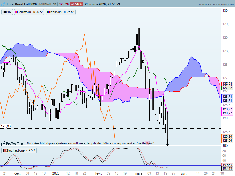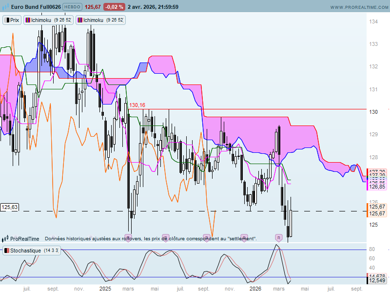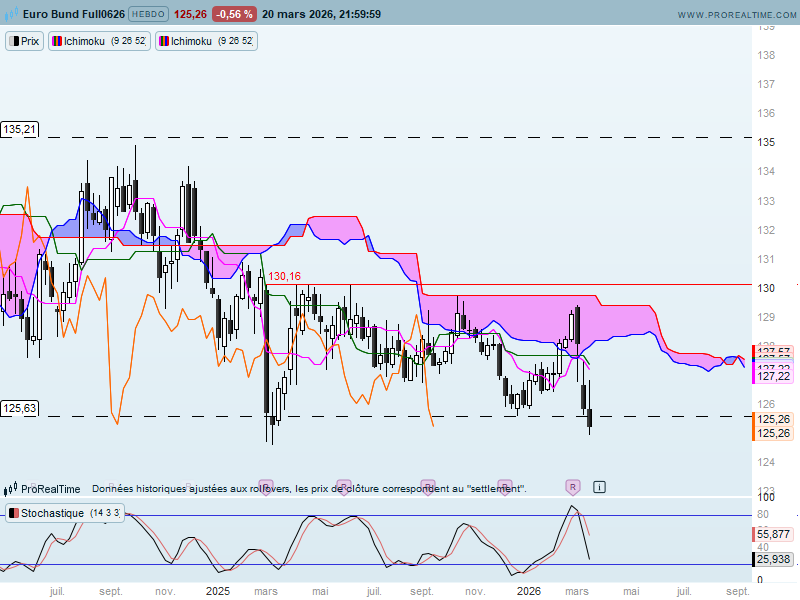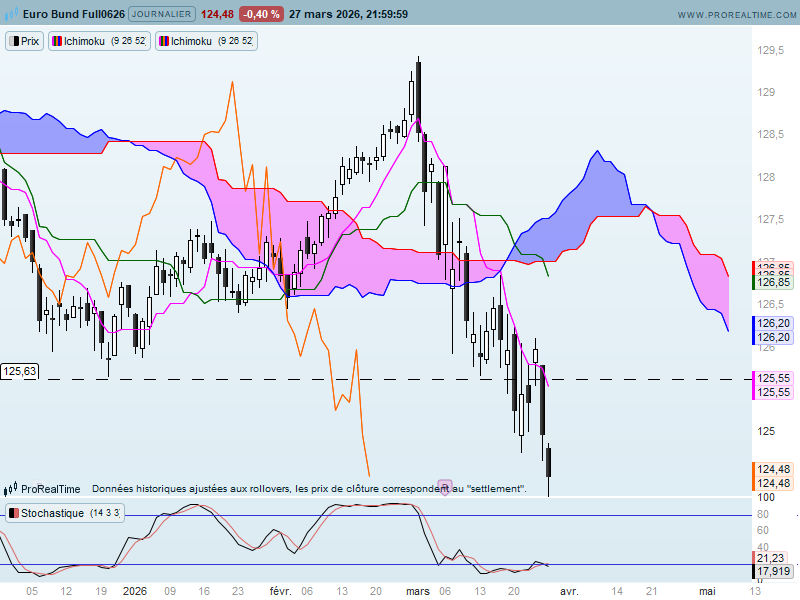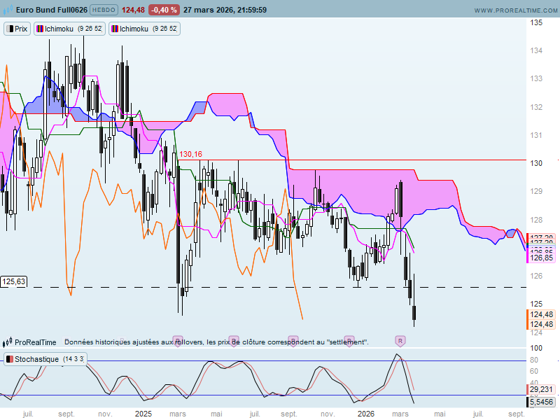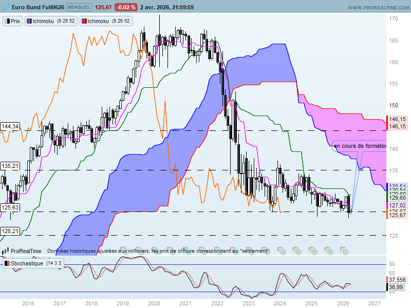 Techniquement la cassure de 125.63 nous amène à envisager la cible suivante située sur 120.21. Elle représente un plat mensuel de KS passée. En équivalent taux et avec une clôture de vendredi à 3.04%, le taux du 10 ans allemand devrait venir chercher le niveau des 3.60%/3.65%.