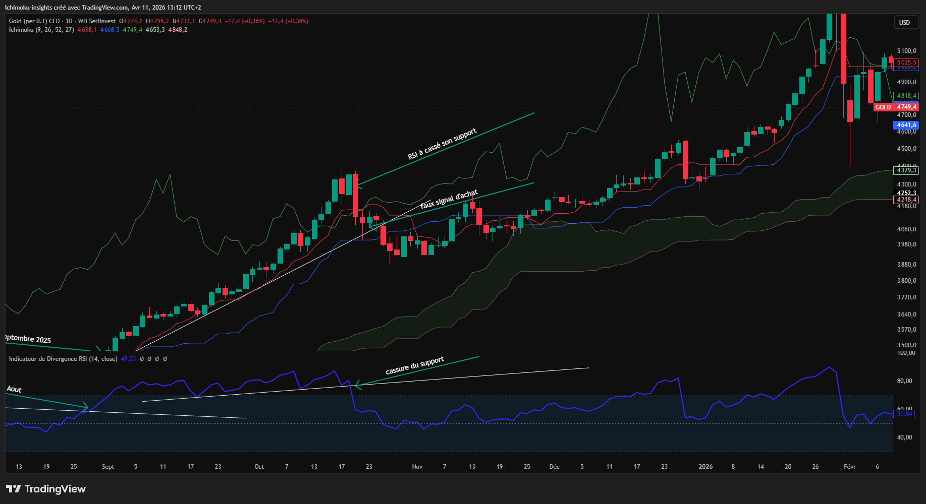 comme le montre le graphique sur l'or le RSi à cassé son support d'ailleurs cela peut être considéré comme un signal vendeur