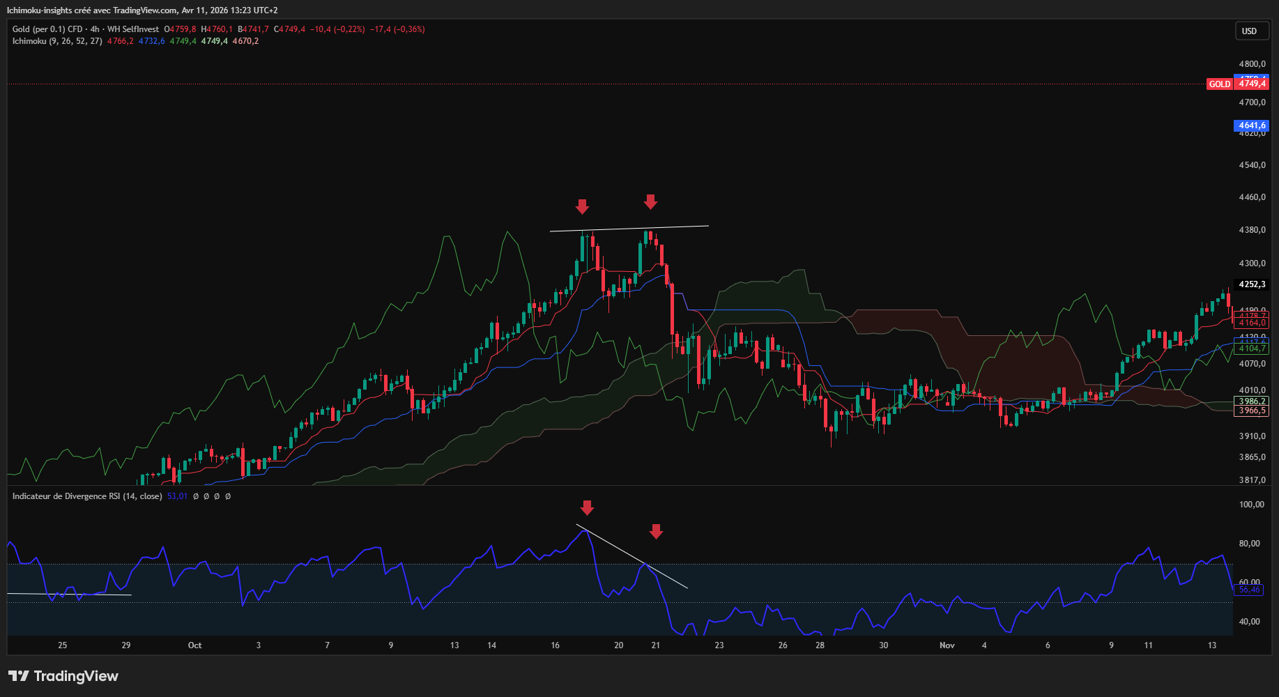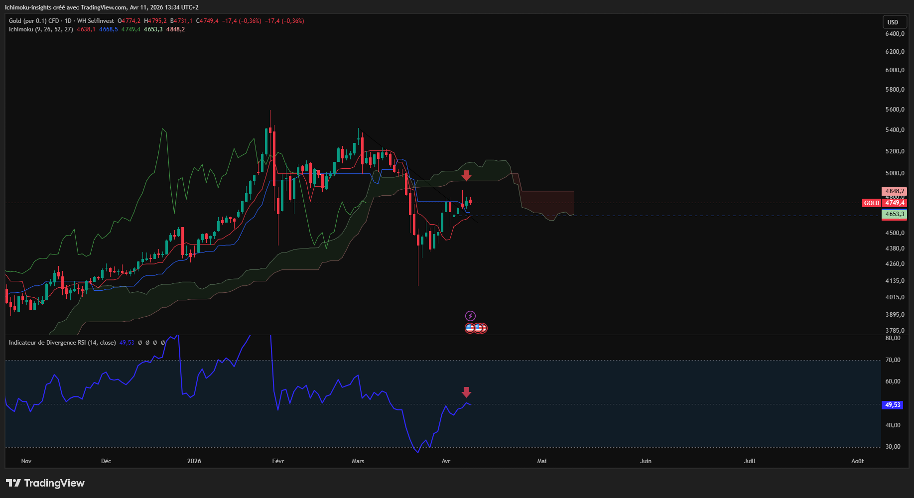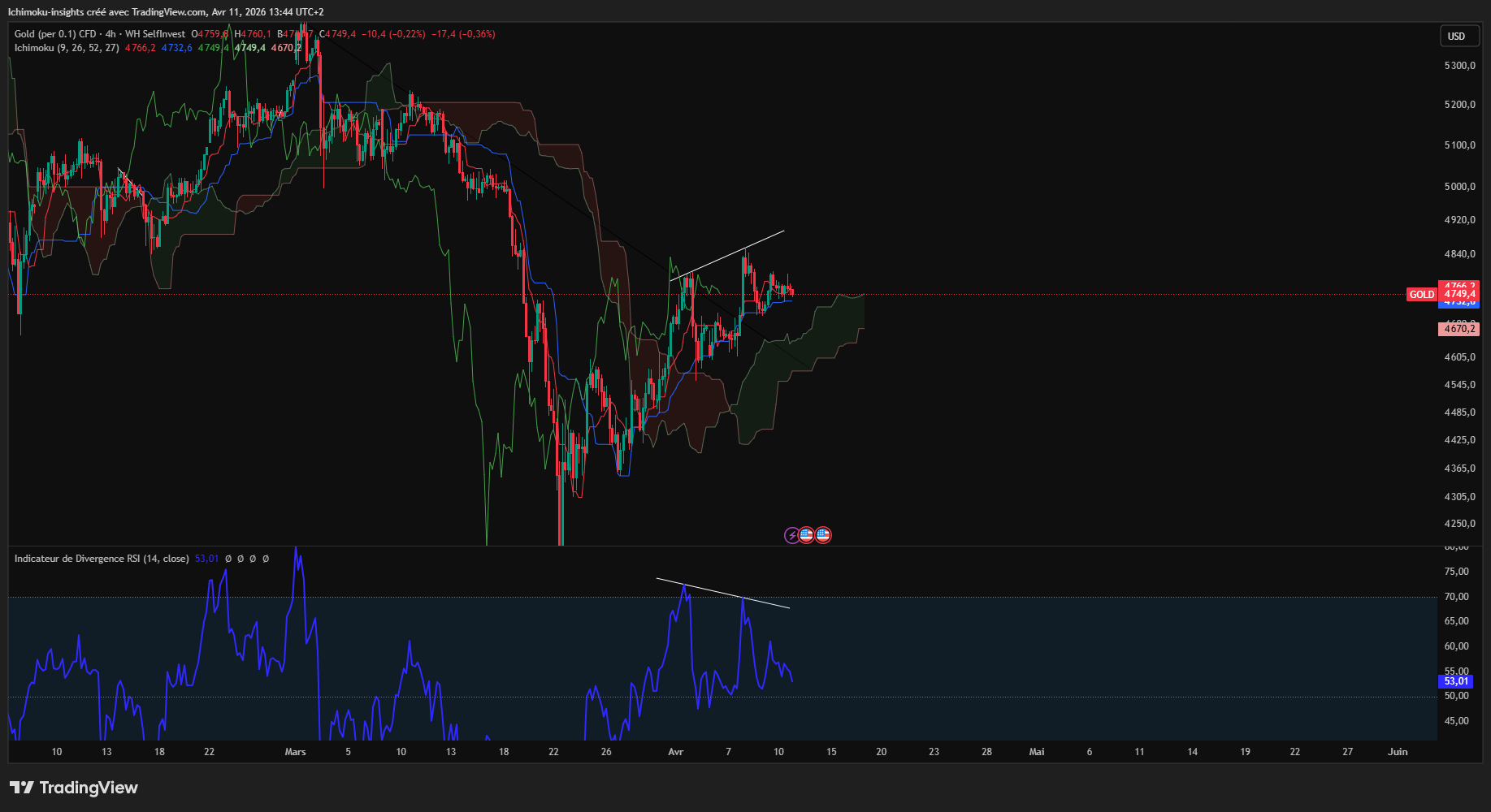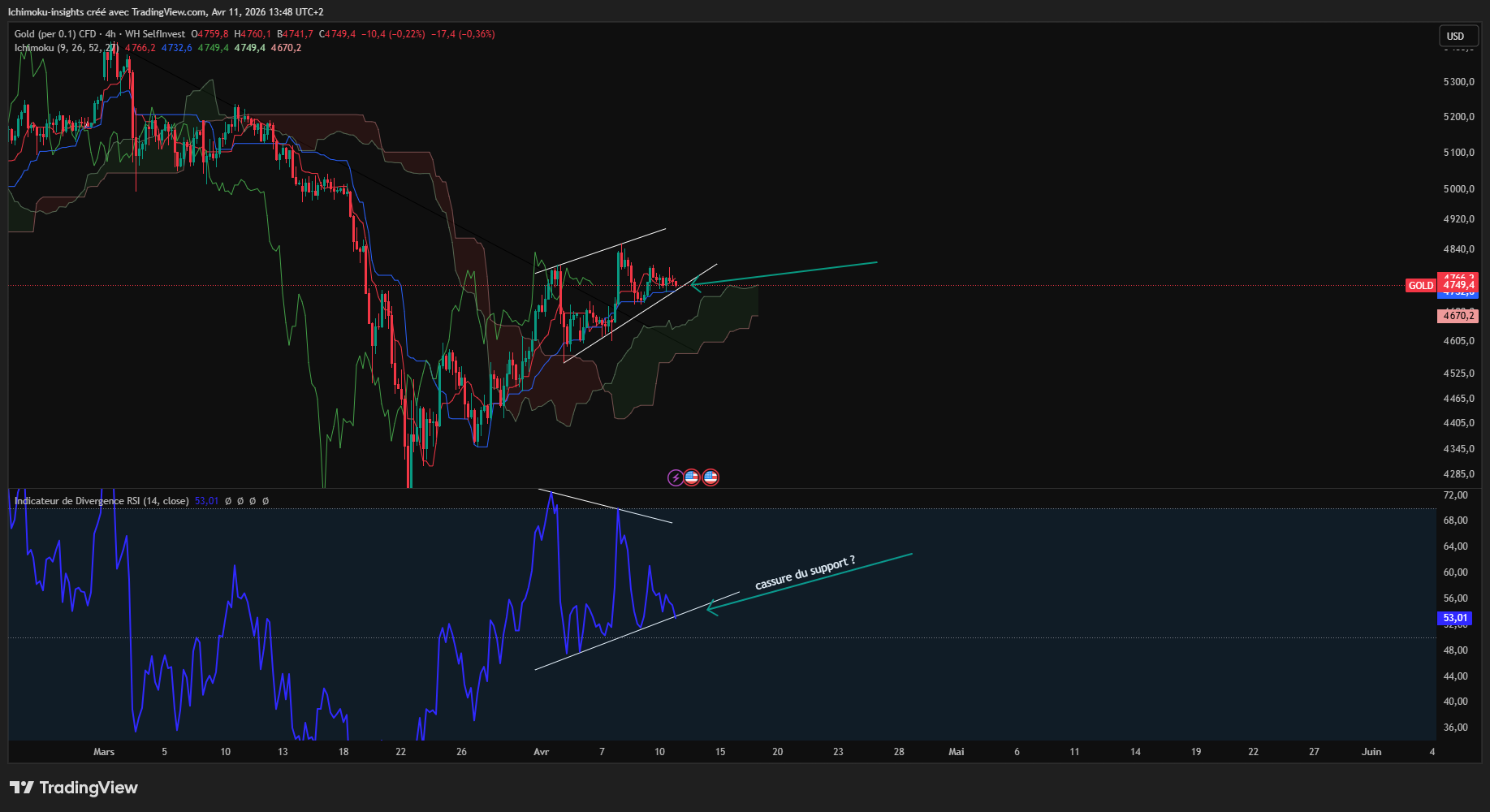 comme avec l'ichimoku il est préférable de naviguer sur différentes UT en H4 nous avons une divergence baissière