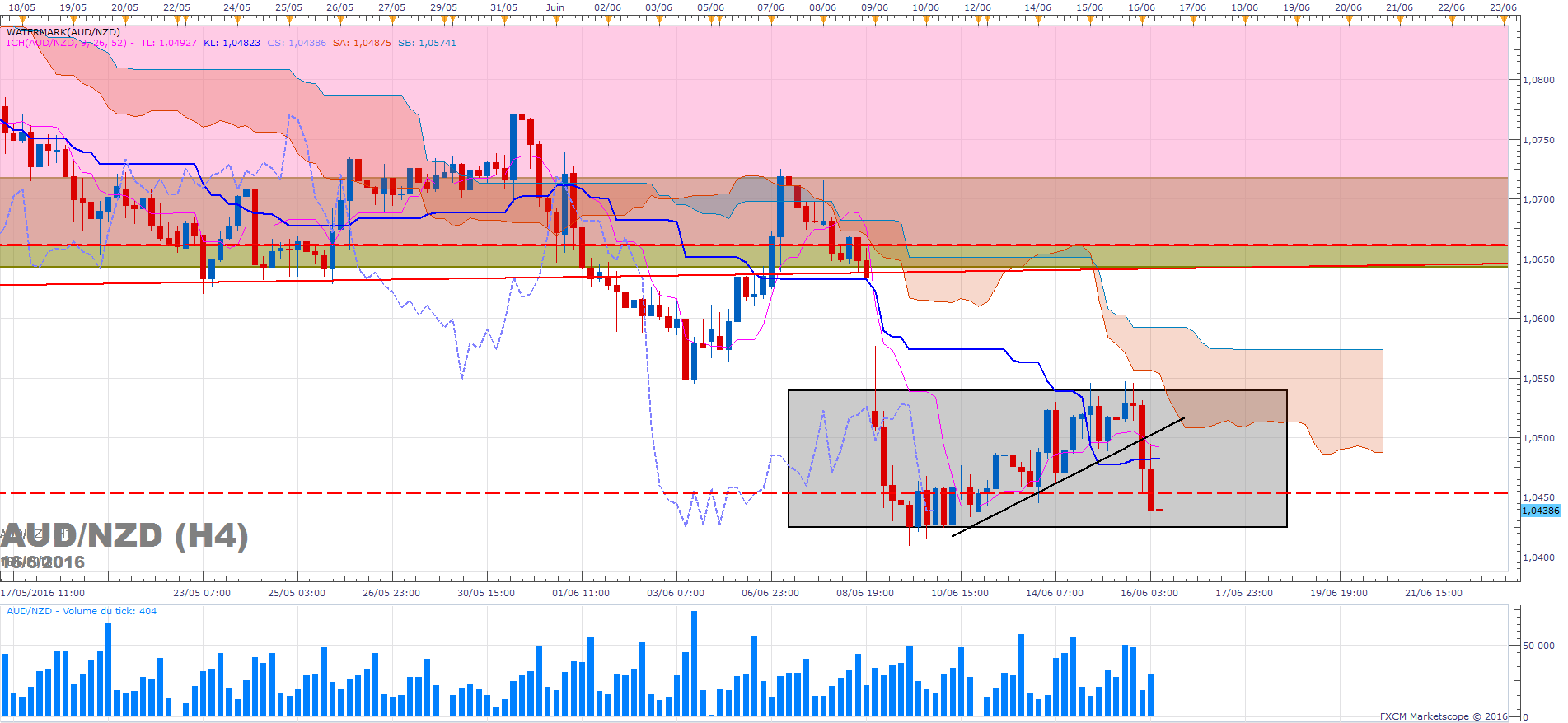 Nous avons notre range. C'est l'ancien range H1 que j'avais tracé dans ma précédente analyse qui est passé en range H4. On voit, sur ce coup-là, la pertinente de tracer les ranges en tenant compte des niveaux (notamment SSB et Kijun) Ichimoku. La bougie H4 qu'on clôture dans 3 minutes est moche. C'est probablement suite au discours de la BoJ ! l'AUD et le JPY sont relativement (en tout cas géographiquement) corrélés.