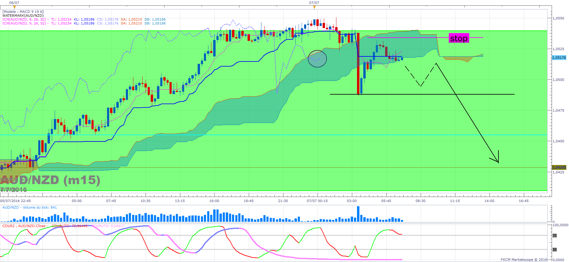 Notez que le cycle long est baissier et que le court va sortir de sa zone de survente. De ce point de vue, on est OK pour shorter.