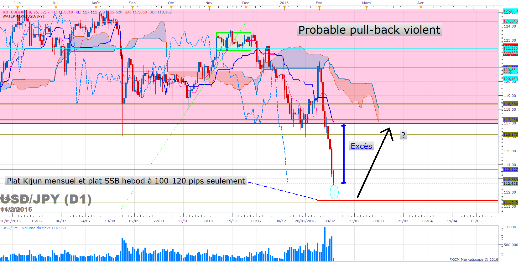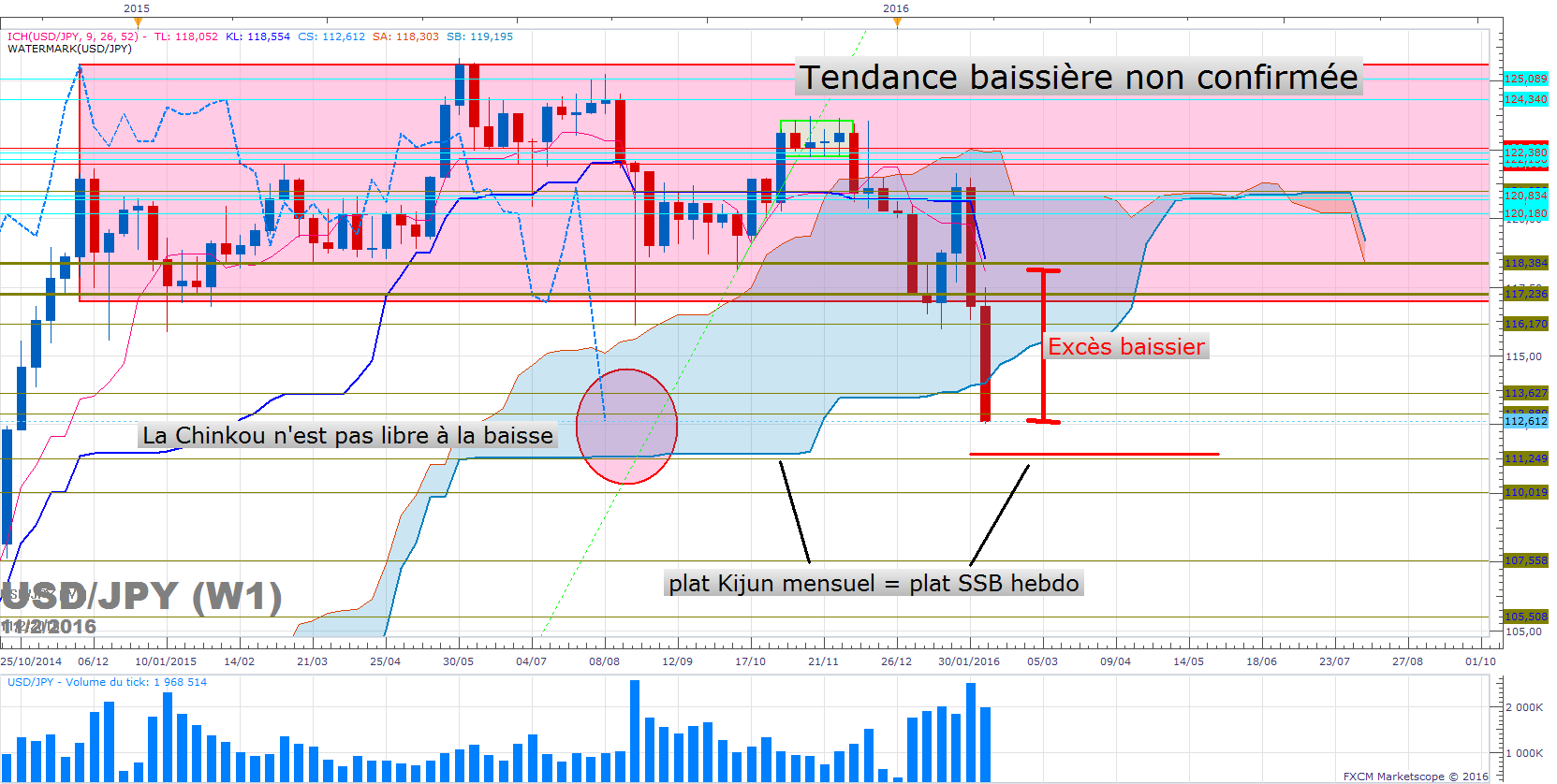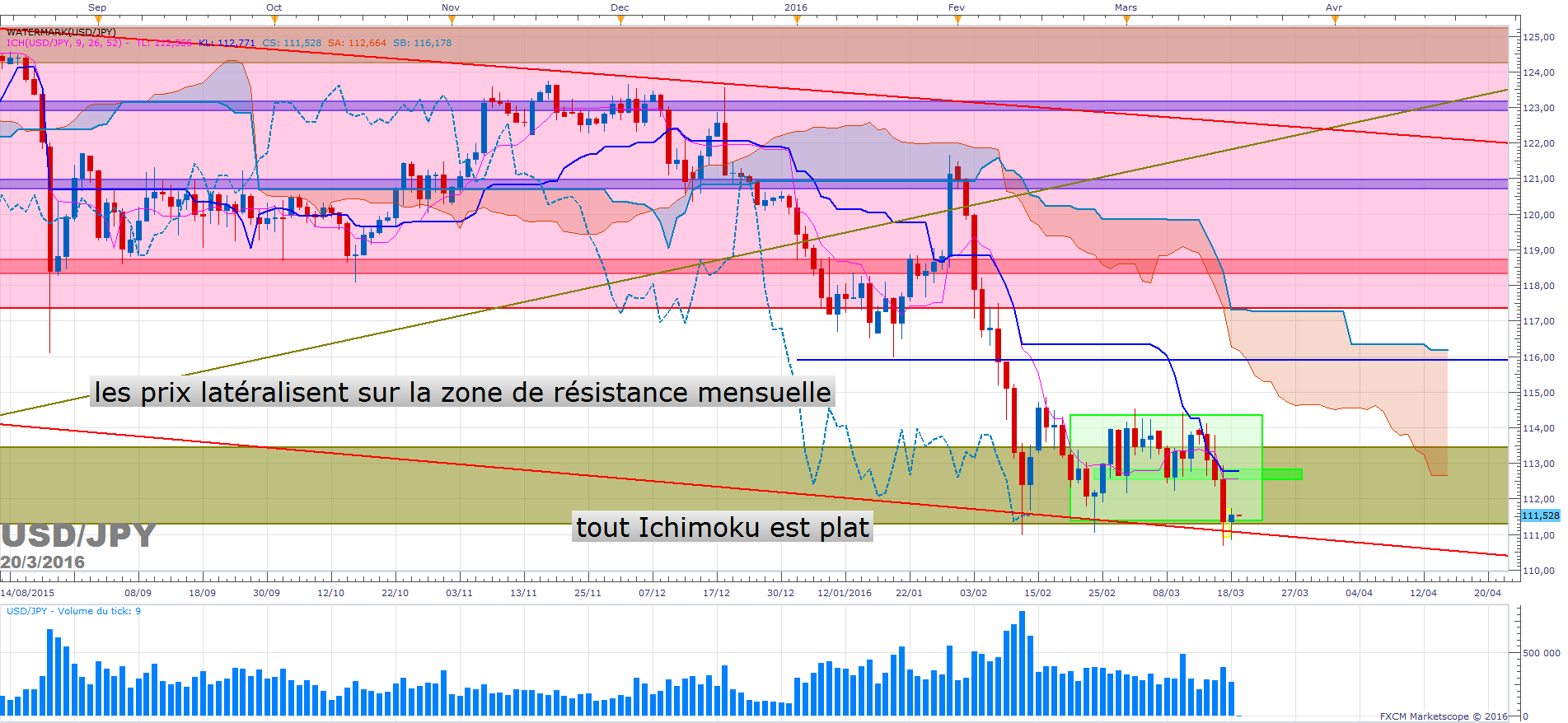 CCL pour plan de trade: surveiller aujourd'hui le H4 et le H1. Si les prix approchent du support rouge (plat Kijun mensuel = plat SSB hebdo) et SI ET SEULEMENT SI il y a des chandeliers de retournement (étoile du matin, avalement...), on pourra entrer long avec un stop sous le précédent plus bas.