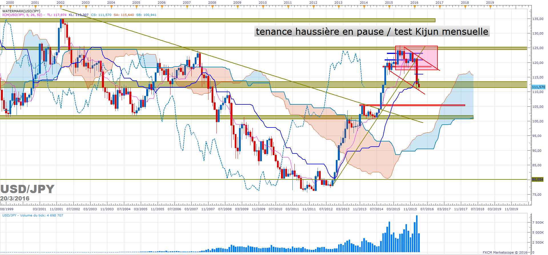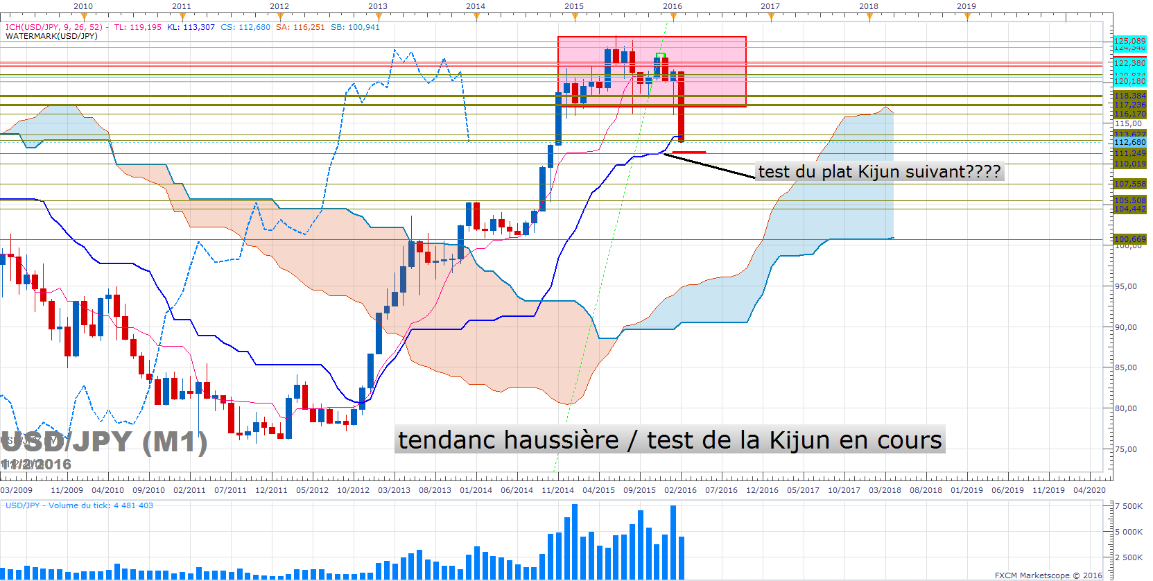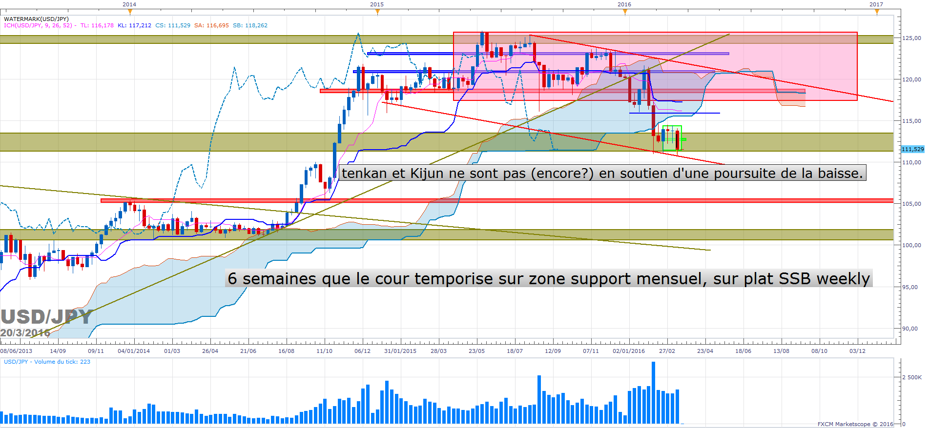 la tendance est haussier. Le test de Kijun en cours n'invalide pas encore la tendance haussier sur le long terme. Sur cette UT, le marché a simplement corrigé des excès haussiers et se pose sur une zone de support très importante (et assez épaisse également).