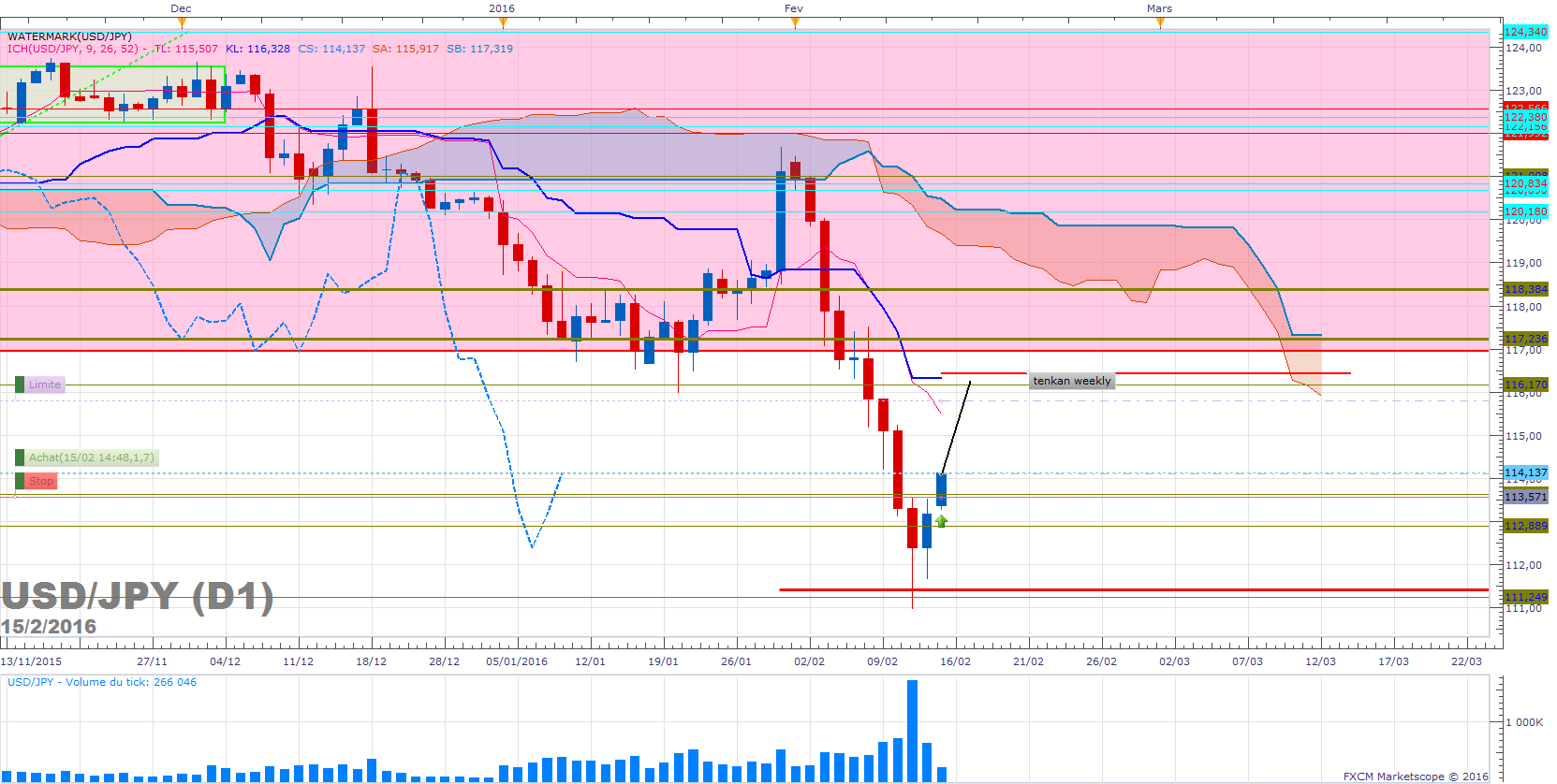 Sur le daily, le pull-back est bien initié. On peut viser la zone des 116.17 puisqu'elle correspond à une zone de Kijun daily et de Tenkan weekly. C'est cohérent.