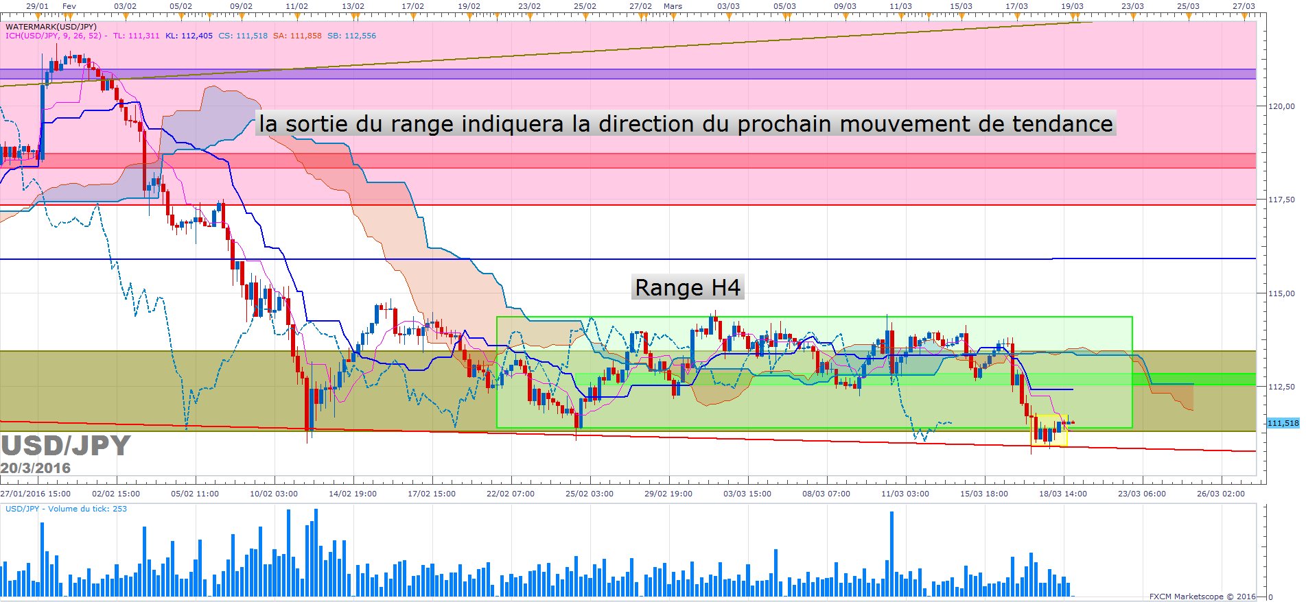 Plan de trade: attention, ca ira très vite. Il faudra donc se tenir près sur le H4 et H1 pour prendre un swing que quelques jours pas plus. Perso, j'ai perdu trop de swing en février. Je privilégiai des trades intraday. Si cassure du range, attention de bien vérifier qu'elle est accompagné de volume, sinon, préférer attendre le pull-back.