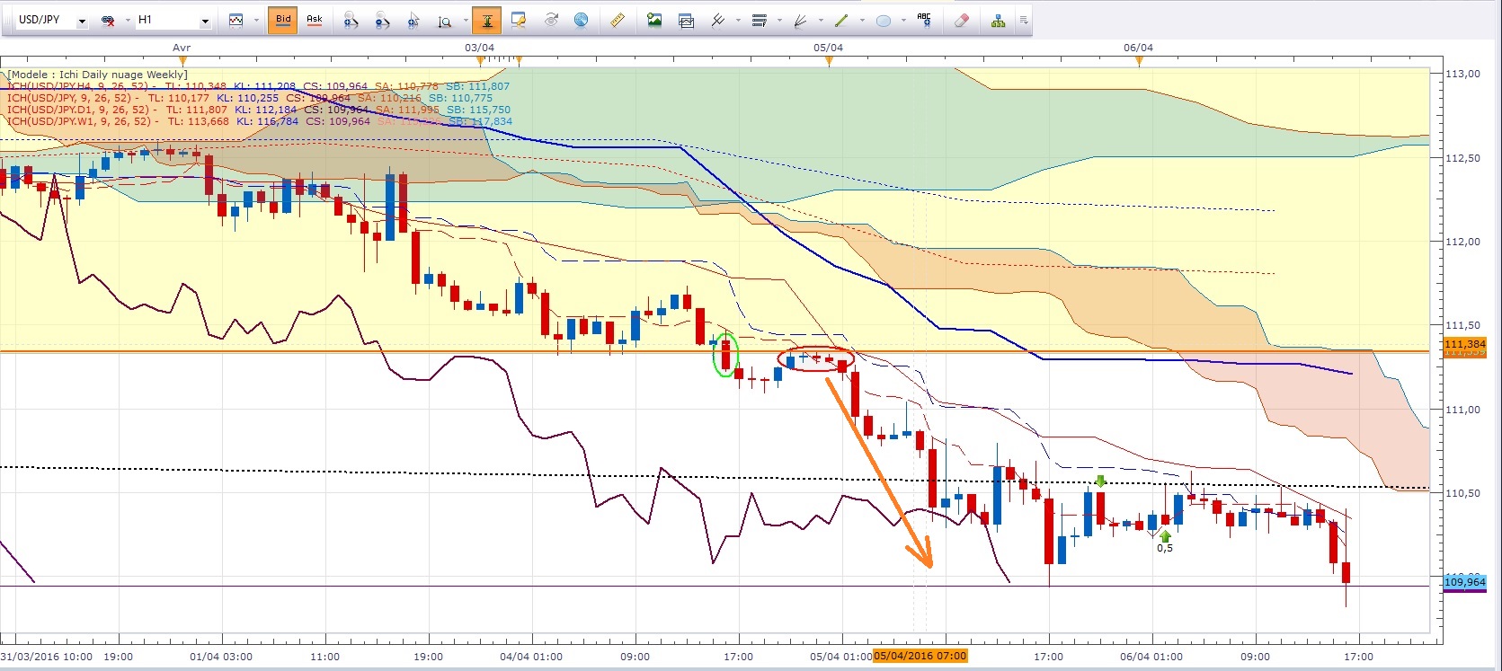 Tu remarqueras que sur le H4, c'était mon objectif par ailleurs. Objectif qui correspondait comme tu le soulignes, à la SSA du nuage. Mais concernant la Chinkou, je spéculais sur le fait qu'elle franchisse les prix. Si j'en avais tenu compte, je n'aurai pas tradé. Il y a un moment, où il faut s'engager... sinon, on ne fait rien. Mais finalement, c'est toi qui avait raison. Ce matin, j'aurai pu percuter et me dire qui le prix était en échec, mais je ne surveillais pas le H4. Je ne surveillais que le H1.