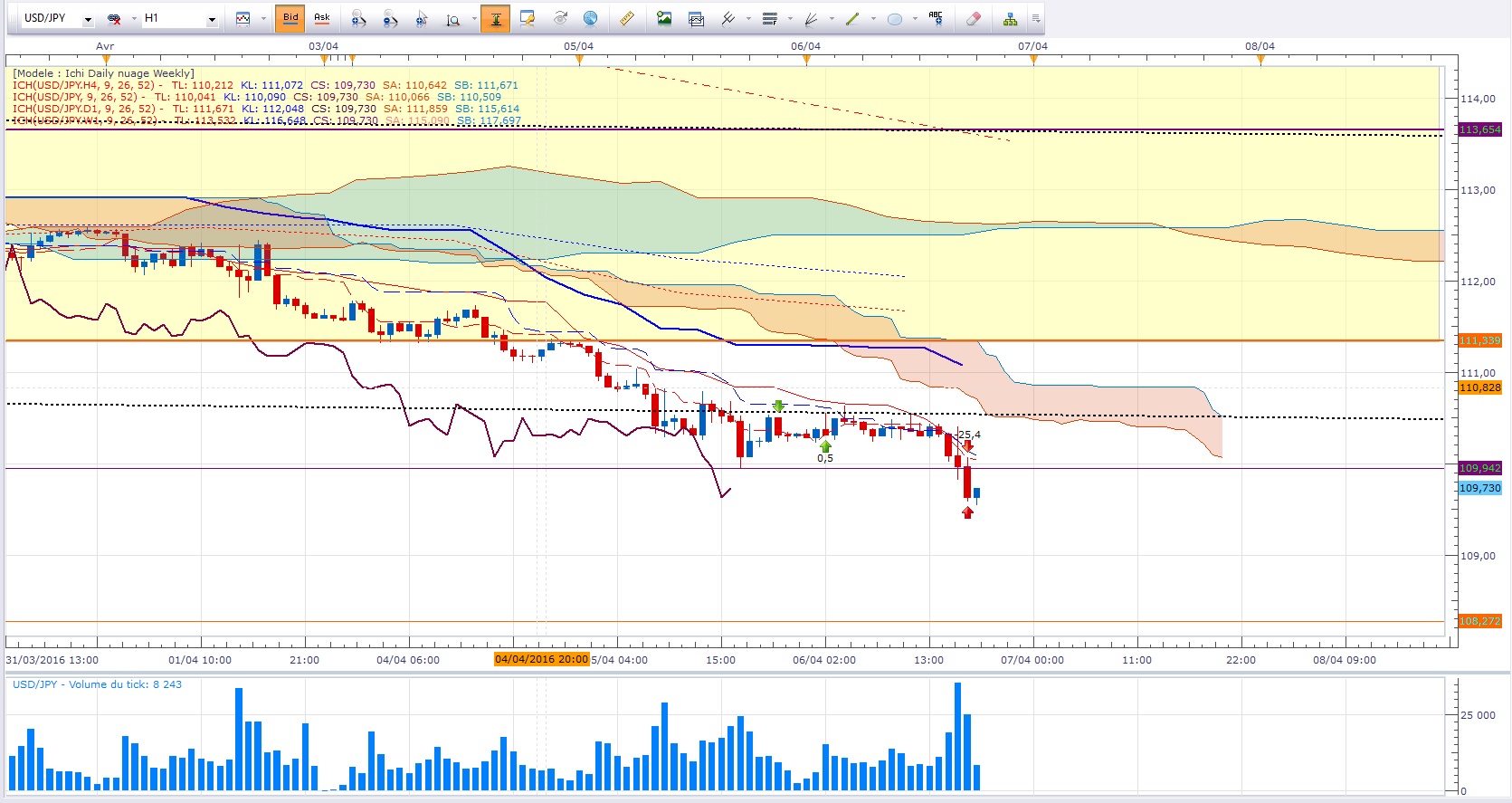 Si le support USDJPY casse, on peut avoir un objectif sur l'extension SSB Weekly suivante à 108.272 - SL à 110.25 au niveau de kijun H1