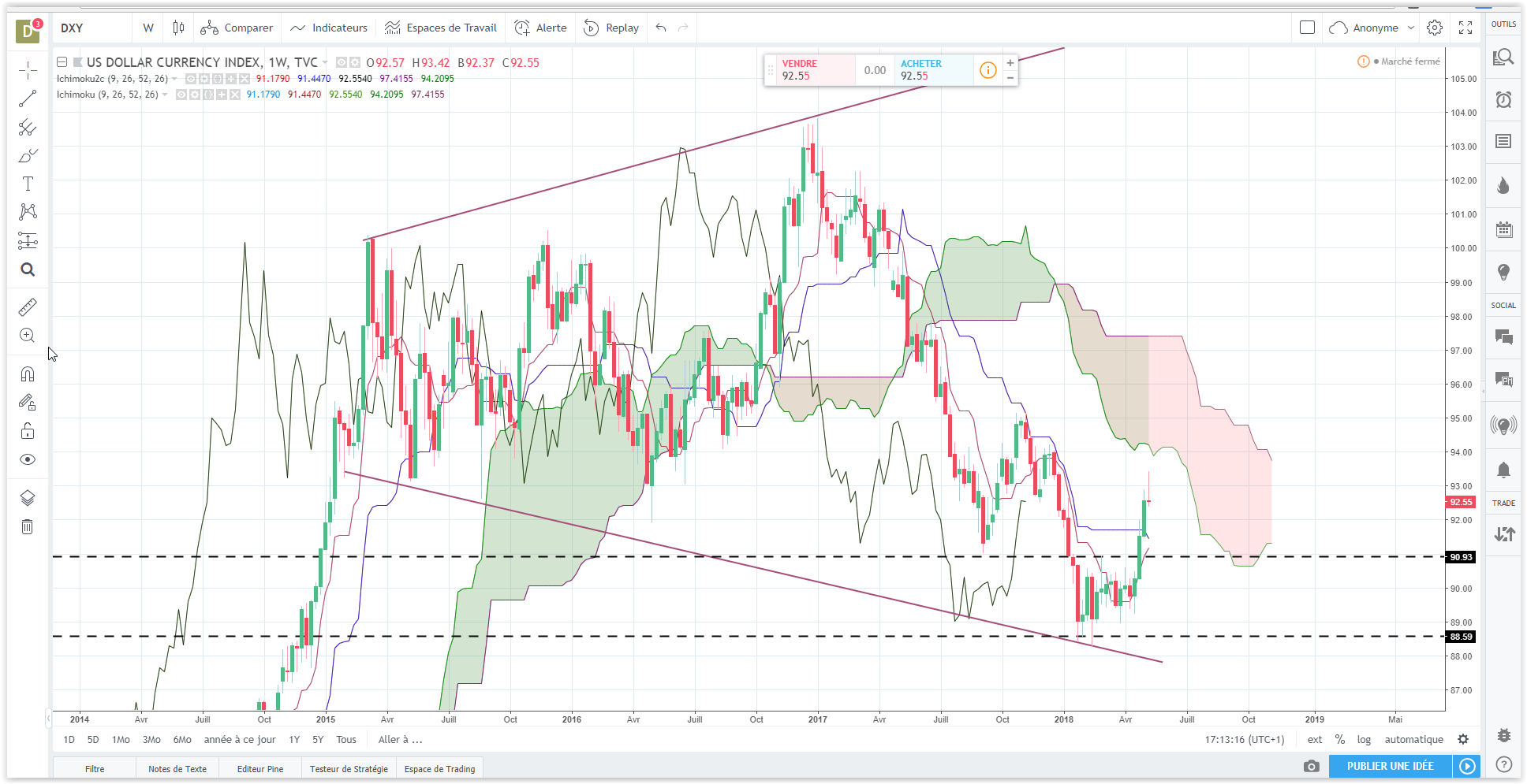 En weekly, nous avons un doji. La fin du mouvement haussier est peut être à envisager même s'il reste un peu de marge au dessus pour rejoindre le Kumo.
