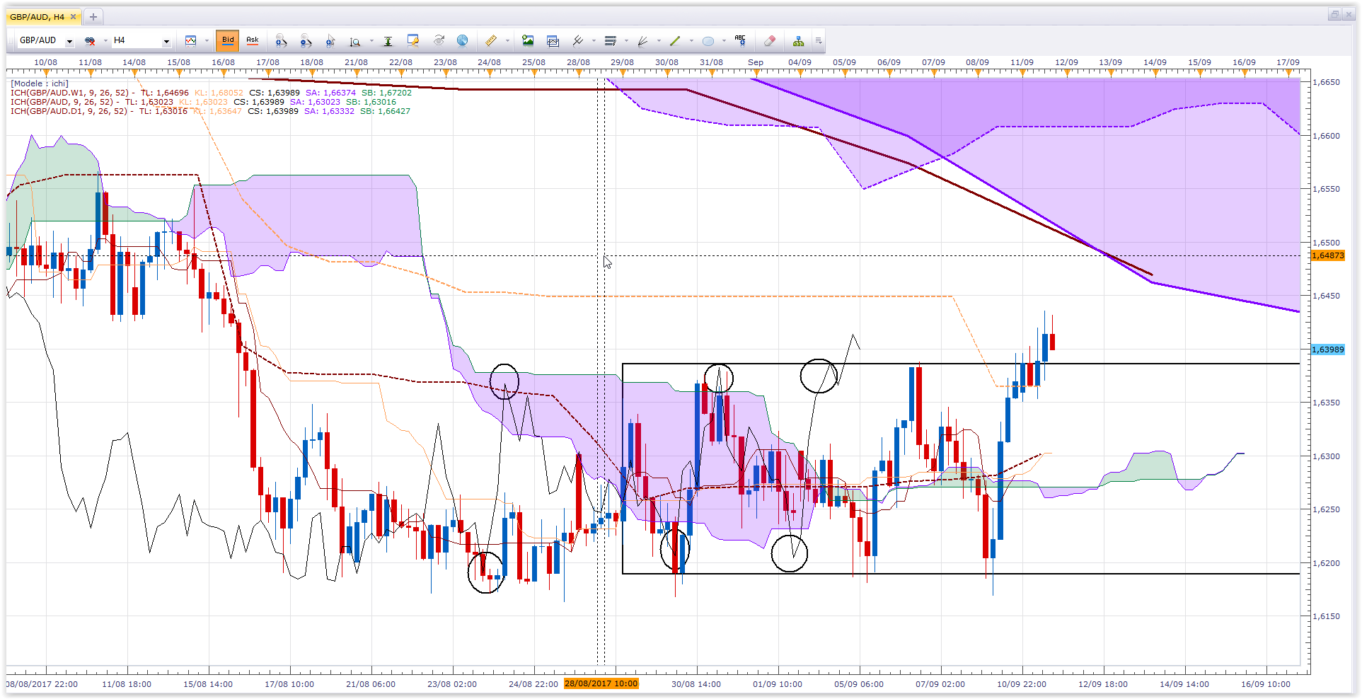C'est parti sans moi ce matin ( au boulot ) s'il y a un pullback je rentre long, où lorsque le Tenkan H4 se détachera de Kijun ( Katana pour le moment ). Notons que nous avons bien une " tête de Chinkou " chère à Khalid.