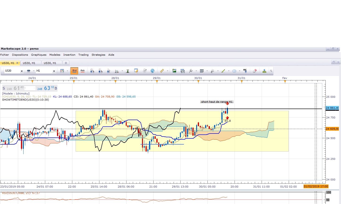 En H4 les prix sont au dessus du nuage dans une belle tendance haussière. Il y a eu une période d’essoufflement qui a provoqué le range en H1. Mais les prix sont repassés au dessus de kijun puis throw back pour donner une nouvelle impulsion à la hausse.