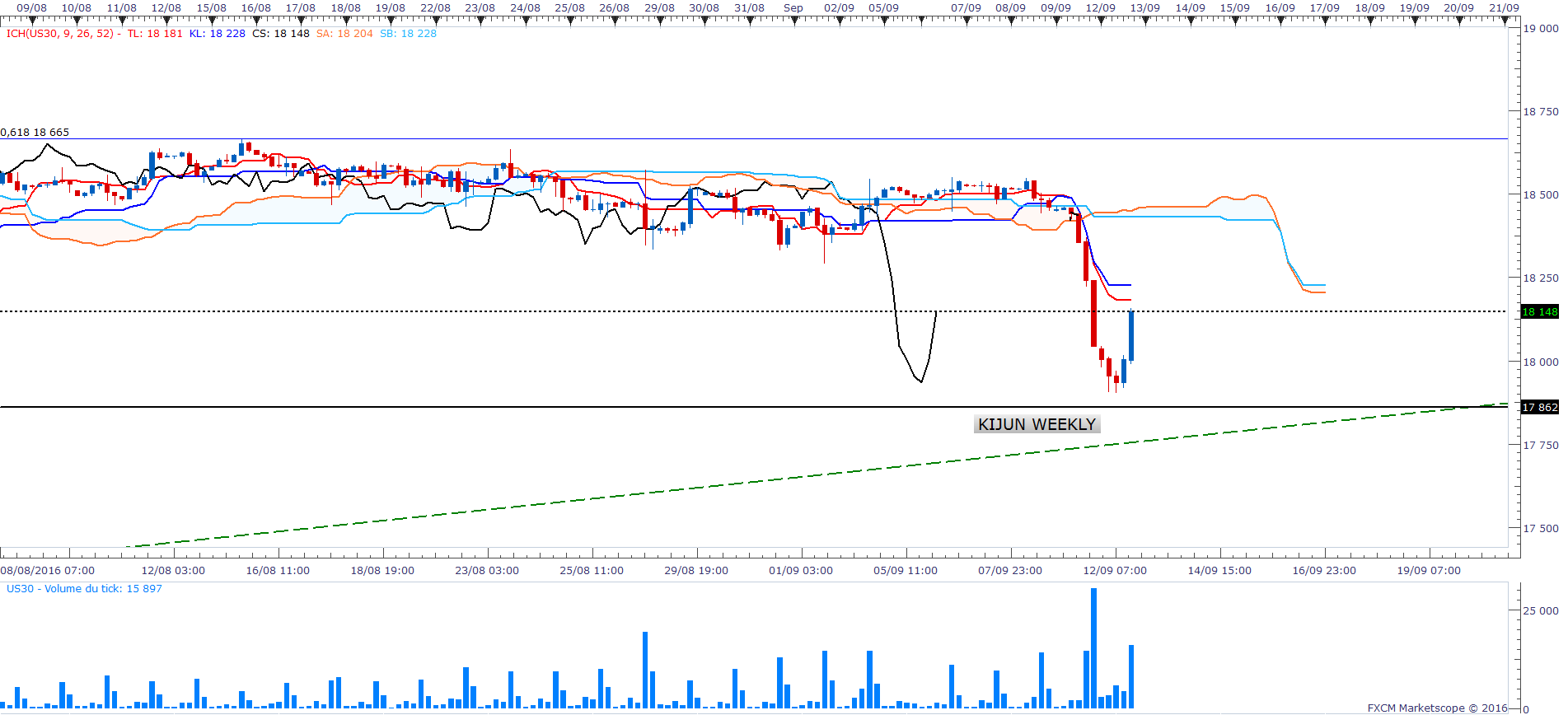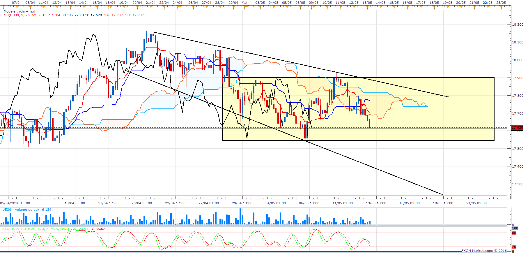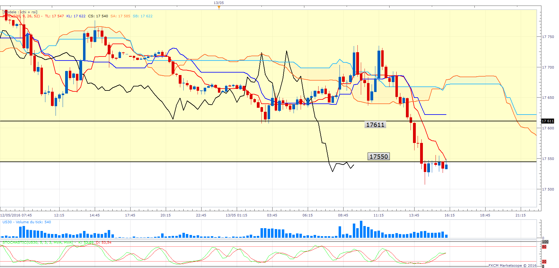 Je pense que si l'indice franchit la droite horizontale à 17611 / 17600 se sera pour aller chercher les 17550