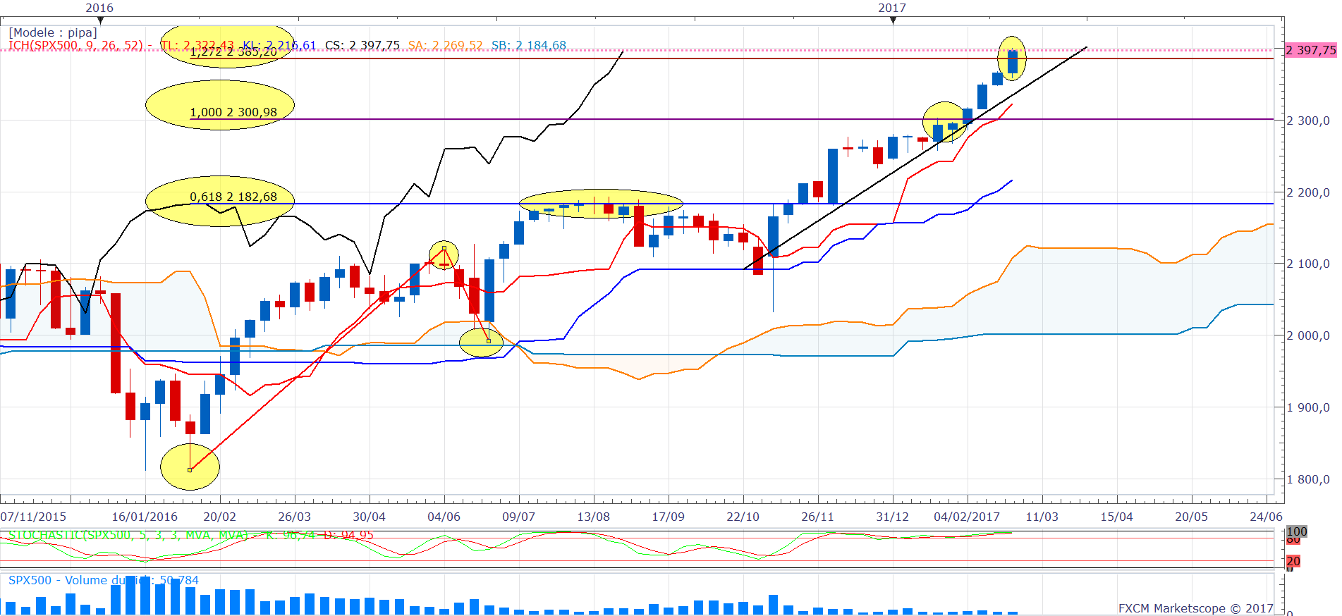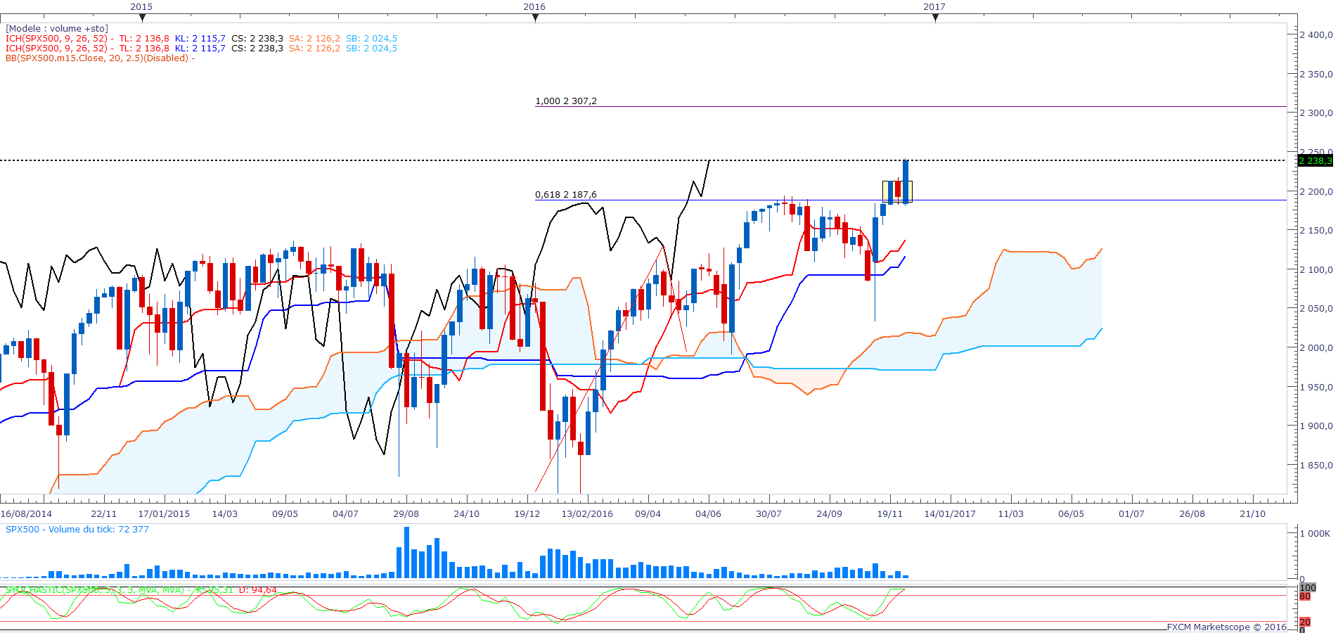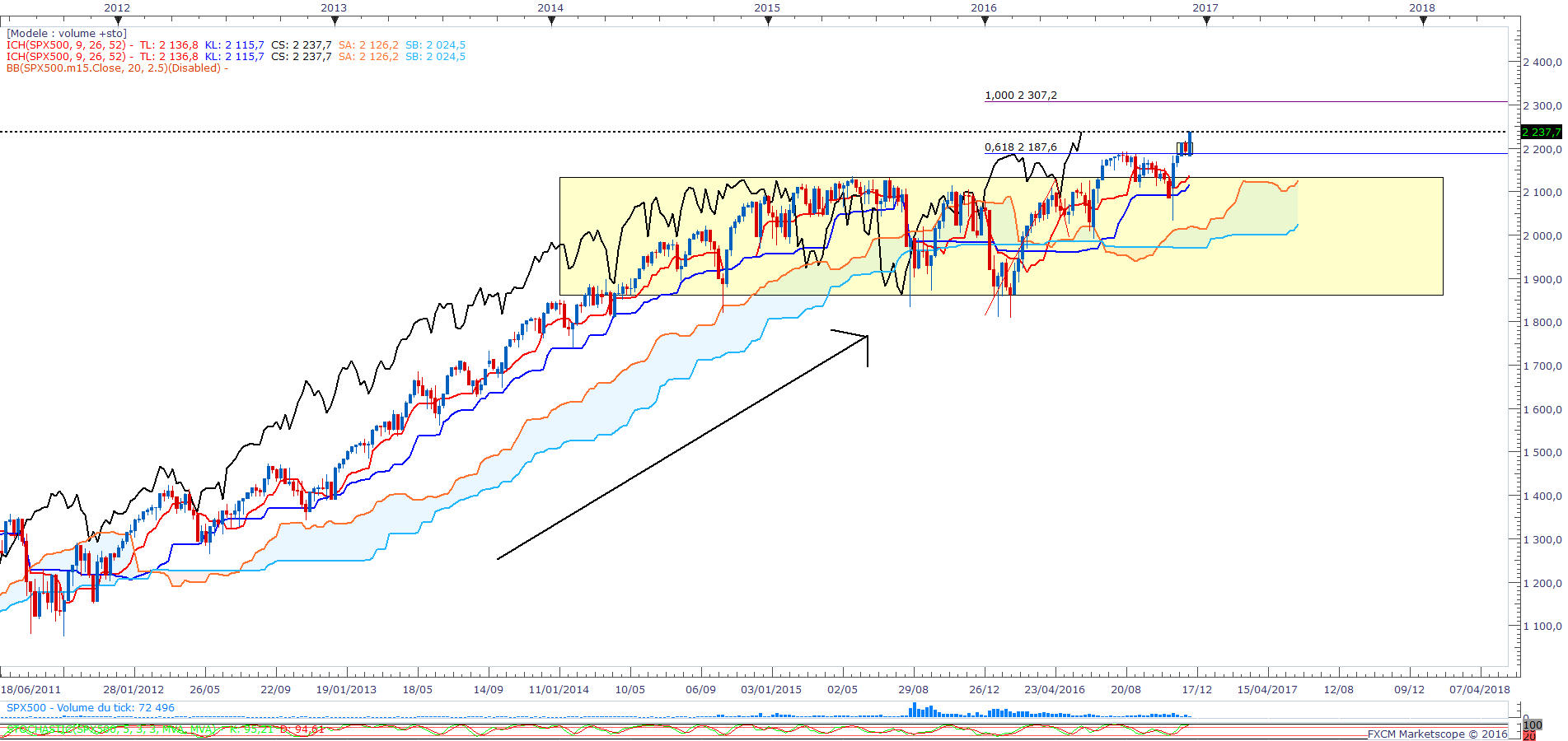 En hebdo, on ne constate rien d'autre que le fait qu'on est fait un soulèvement de la borne haute tracé à presque 2400.