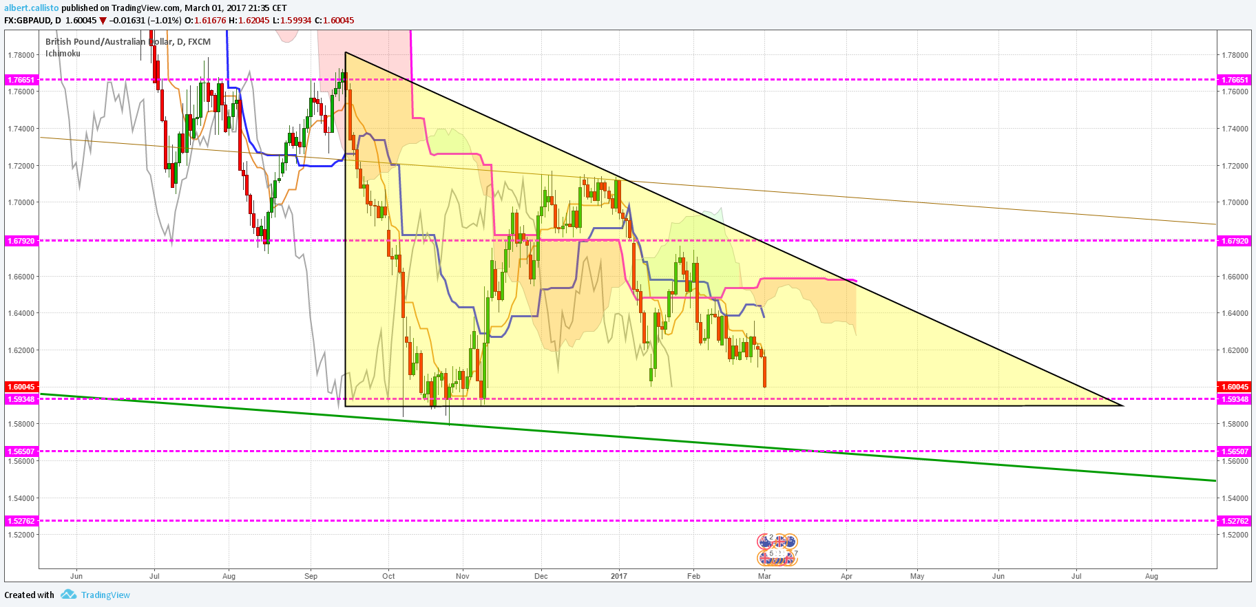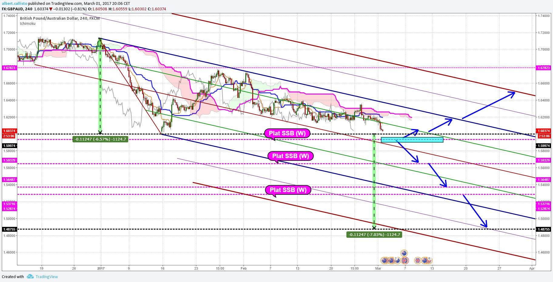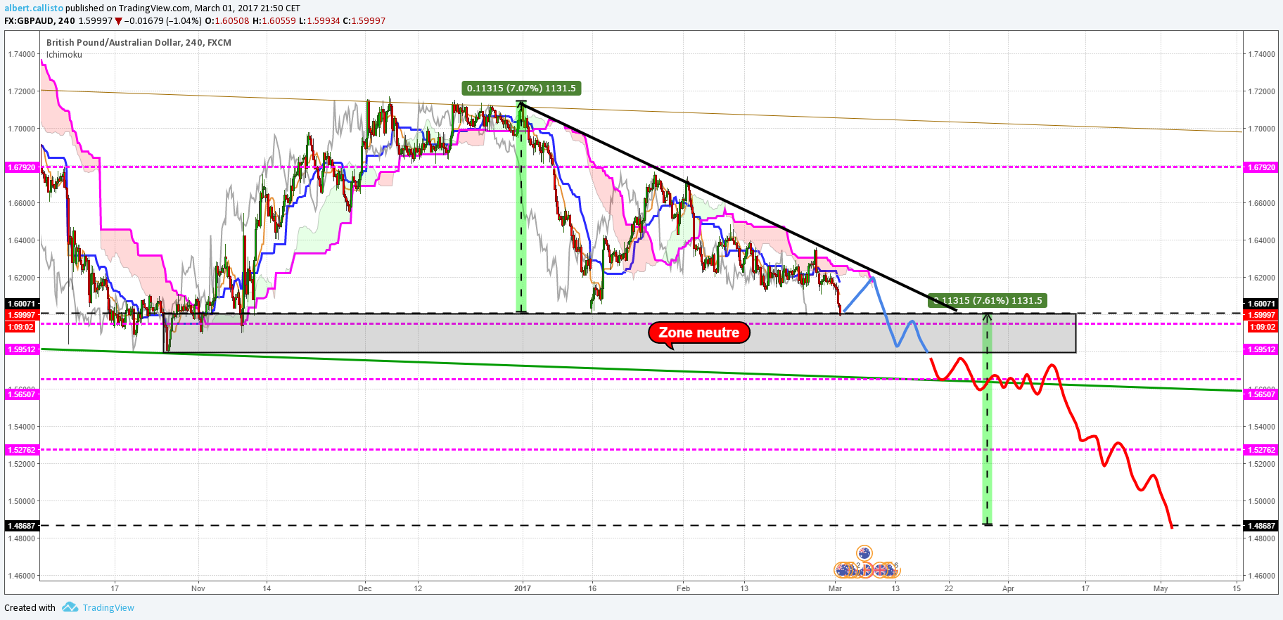 Le risque de cassure est grand, la pression générale est baissière sur le GBP - nous l'avons vu dans les UT larges. Un scénario plus ambitieux serait d'attendre que le support cède avec un marché qui gravite dans cette zone que j'ai qualifiée de "neutre" : on remarque que le marché avait réintrégré la zone des 1.6 en novembre. Un avalement des plus bas de novembre offrant une sortie de cette zone "neutre" permettrait d'aborder une vente après pullback avec un objectif que l'on obtient en reportant la hauteur du triangle sur sa base. Les plats SSB entre l'entrée et l'objectif constitueraient des bons niveaux pour alléger ou/et déplacer son stop en positif.