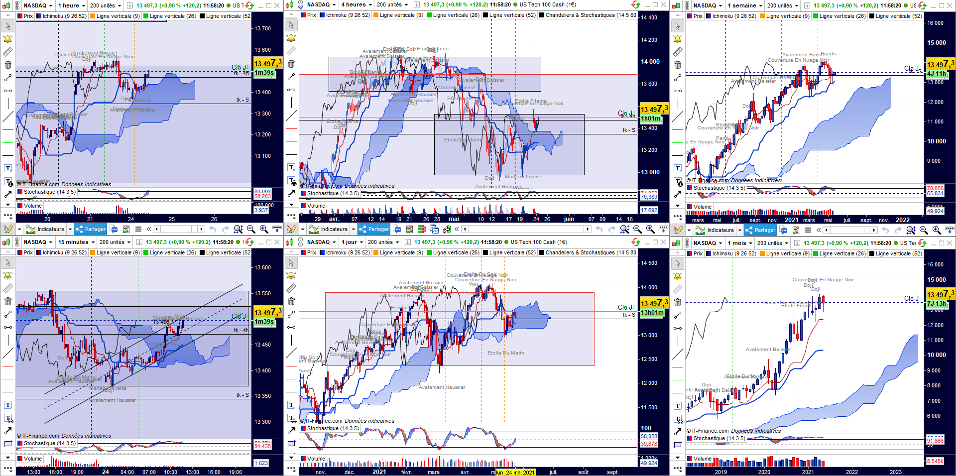 Idem que toi, concernant la cassure kijun H4, vu le chandelier précédent en H4, je verrai bien un replie des prix sur cette kijun, en gros les prix retraceraient 50% vers les 13 530pts (kijun H4) avant de reprendre une phase haussière, mais ça ne vient pas.... et la tendance court terme tient, un range peut être comme tu le dis, j'attends de voir l'ouverture US à 15h30 pour une continuation haussière vers ATH ou replie sur la kijun H4, range ?