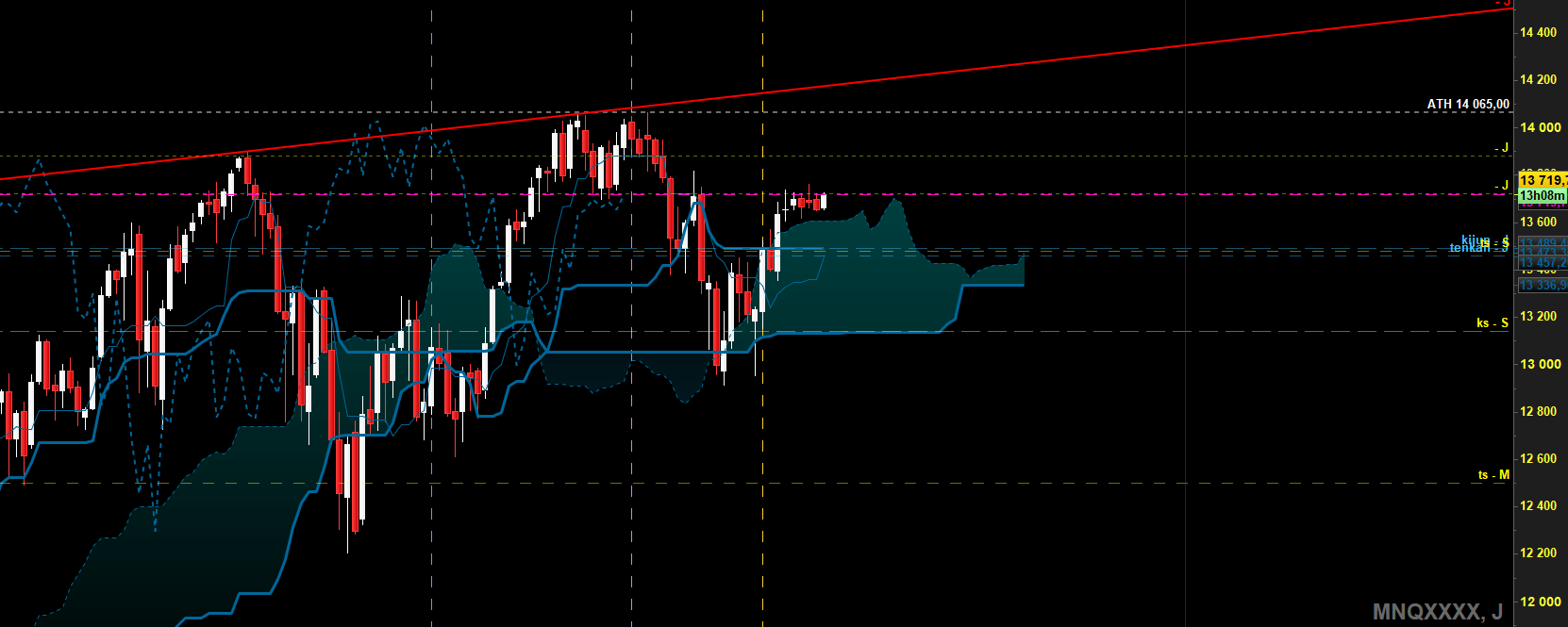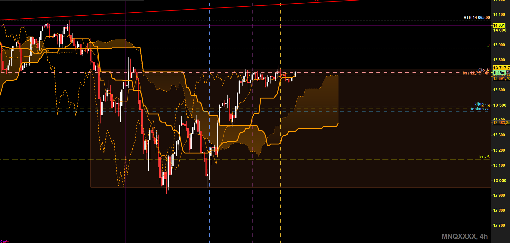 Bonjour, le nasdaq est en haut de son range H4. On voit une ligne en pointillés jaunes à 13880 qui correspond à ce grand plat SSB, mais aussi à la tenkan plate au-dessus de chikou daily. Chikou soutient les prix (donc pas de surachat, ce qui est plus facile pour casser la borne du range)