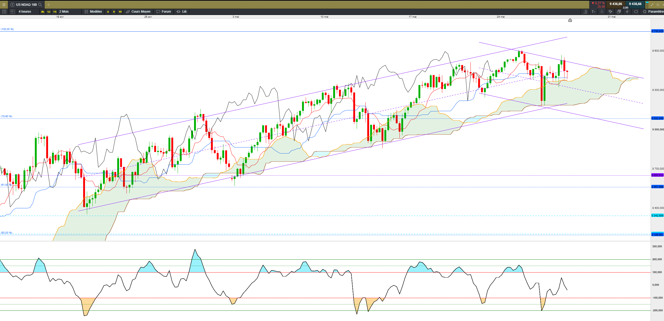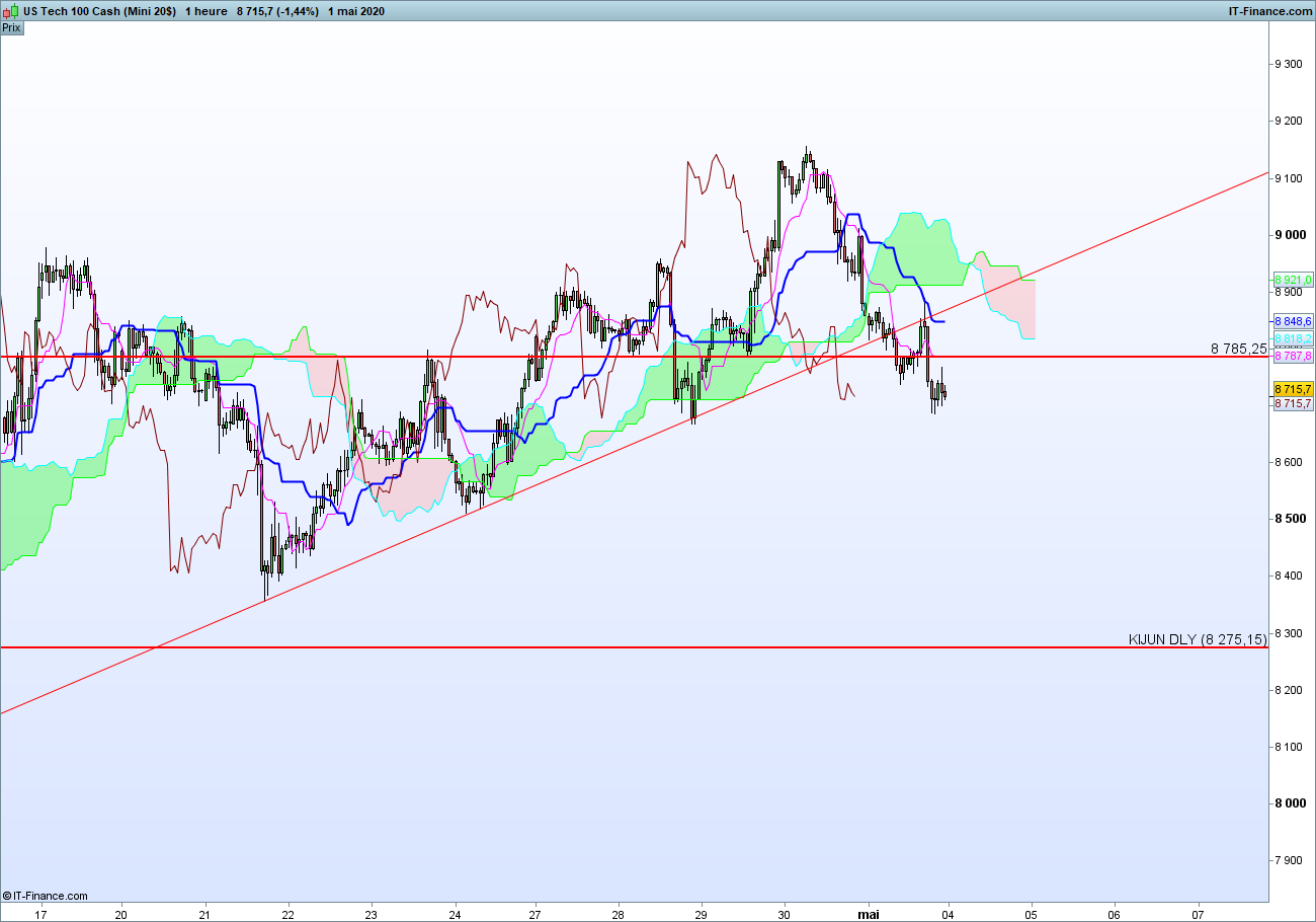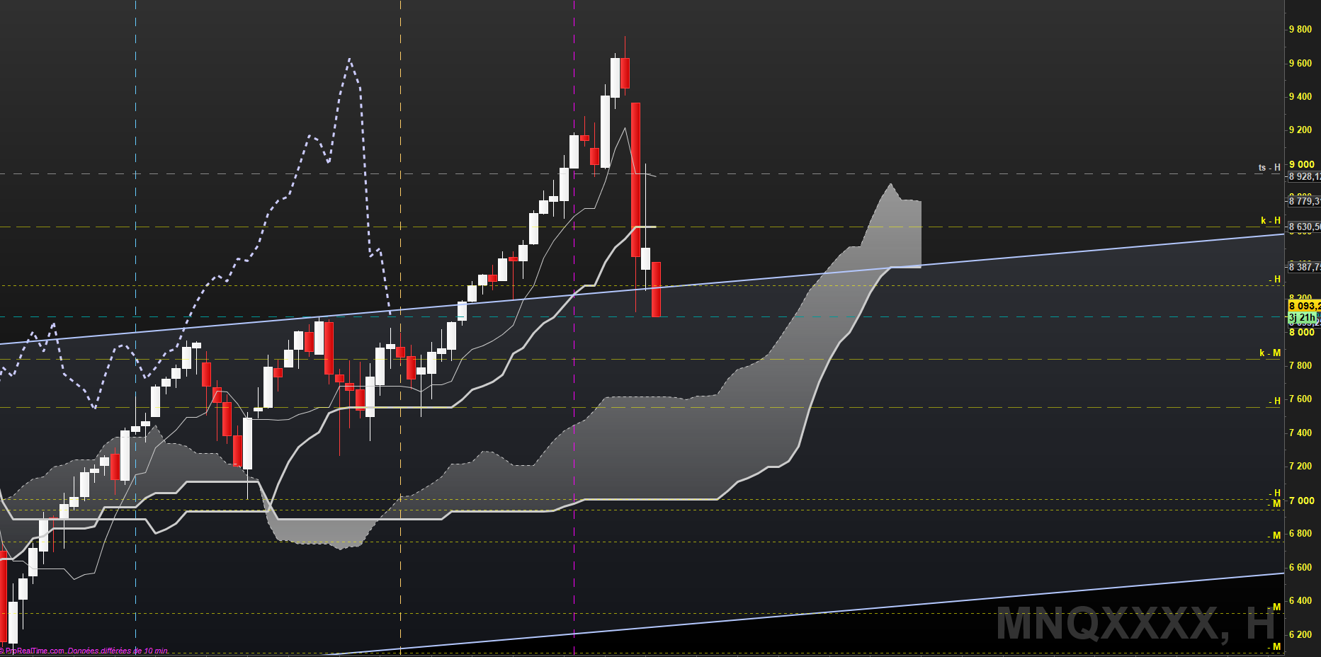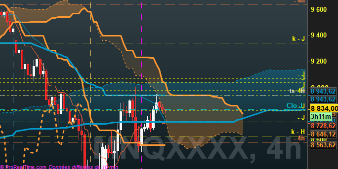 En weekly, sur le Nasdaq, nous allons arriver sur le haut du range(plus haut historique), et nous avons un beau surachat, avec une kijun et une SSb parfaitement alignés.