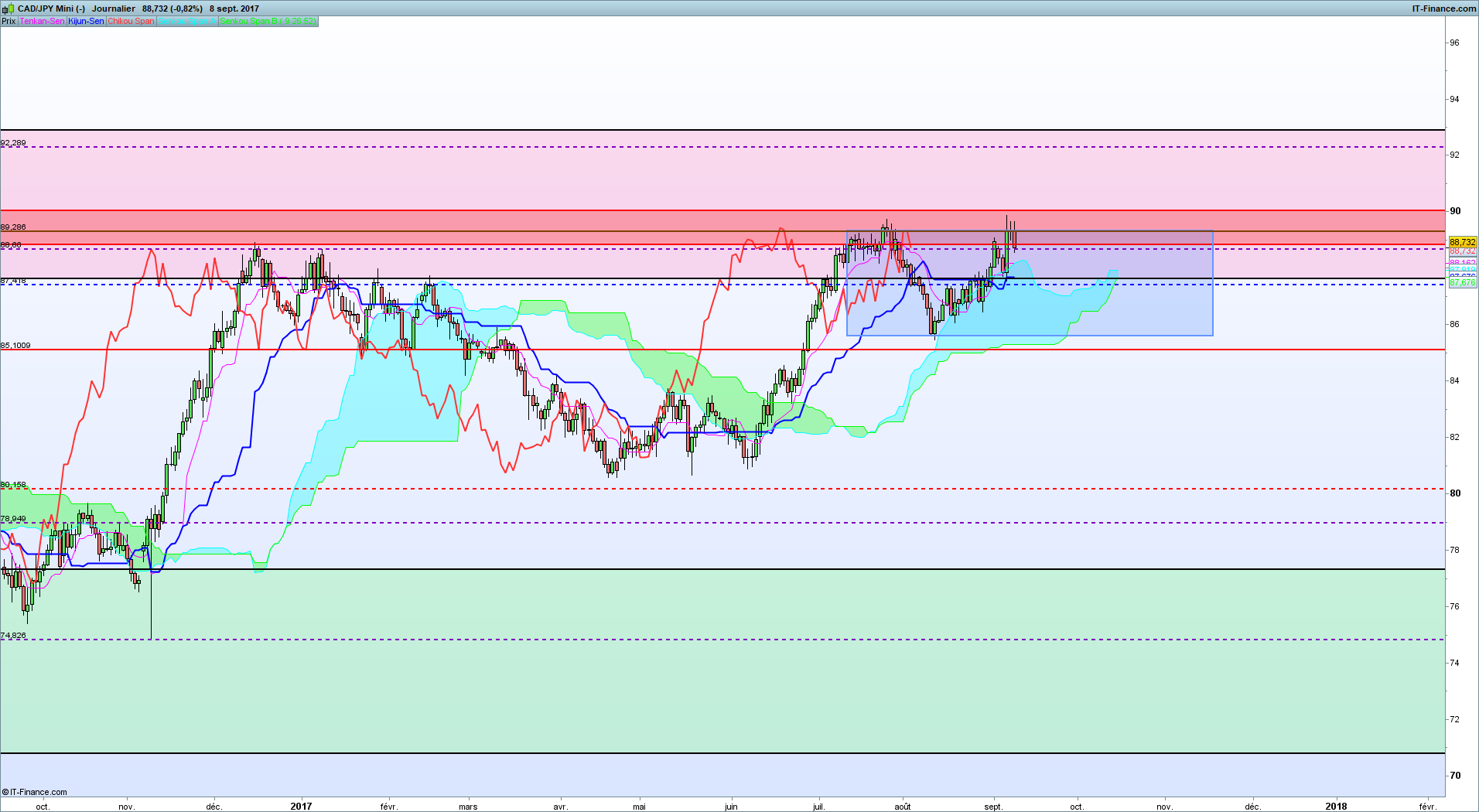 En hebdomadaire, on observe la confirmation de la zone d'overlap sur cette UT, en identifiant une résistance qui a déjà fait barrage au prix début 2017. Ichimoku est mou et ne nous dit pas grand chose dans le sens d'une hausse. Au contraire, on a un magnifique doji la semaine dernière, pile sous résistance. La Tenkan soutien les prix à la hausse mais pas la Kijun ni la SSB.