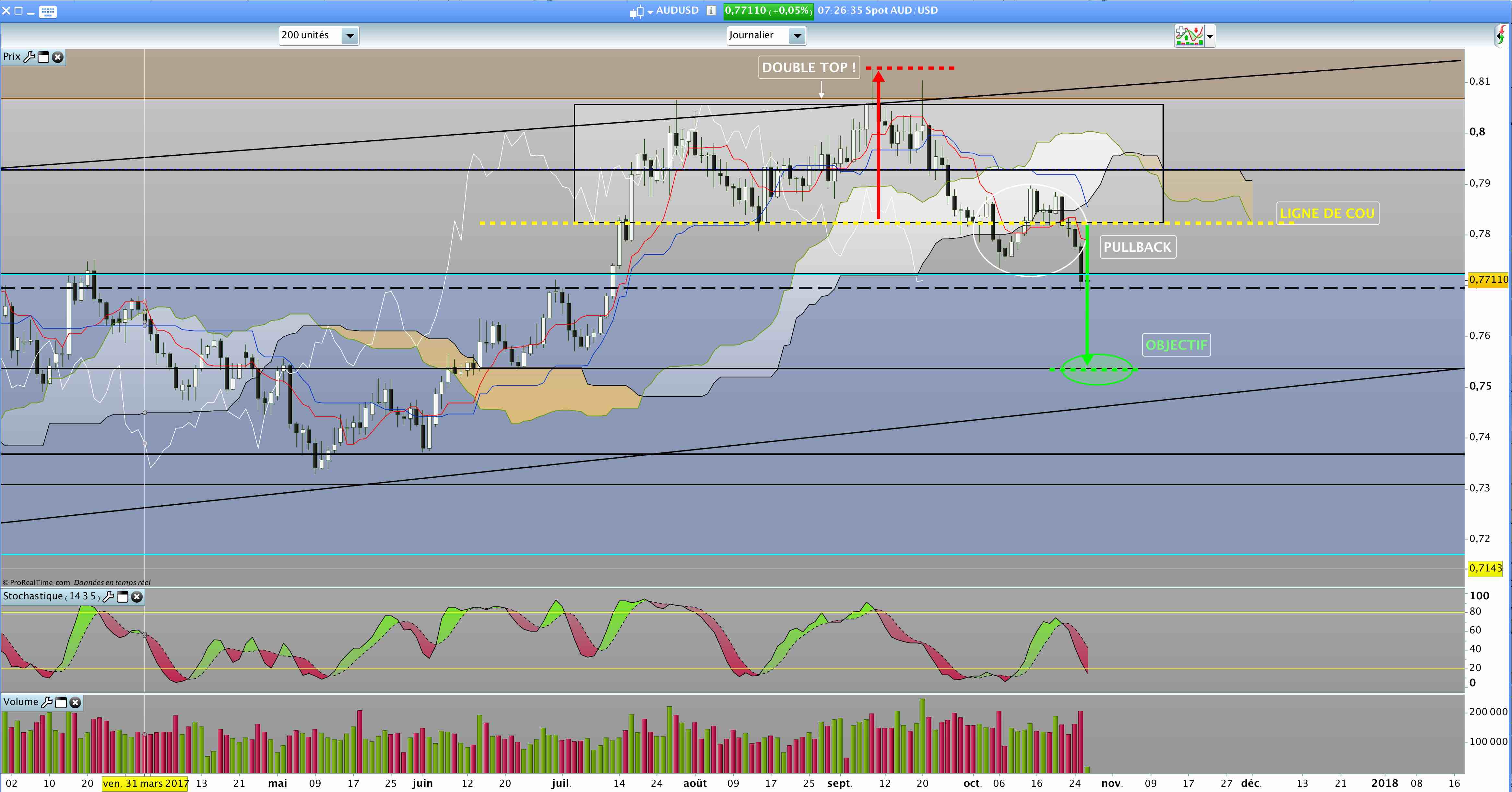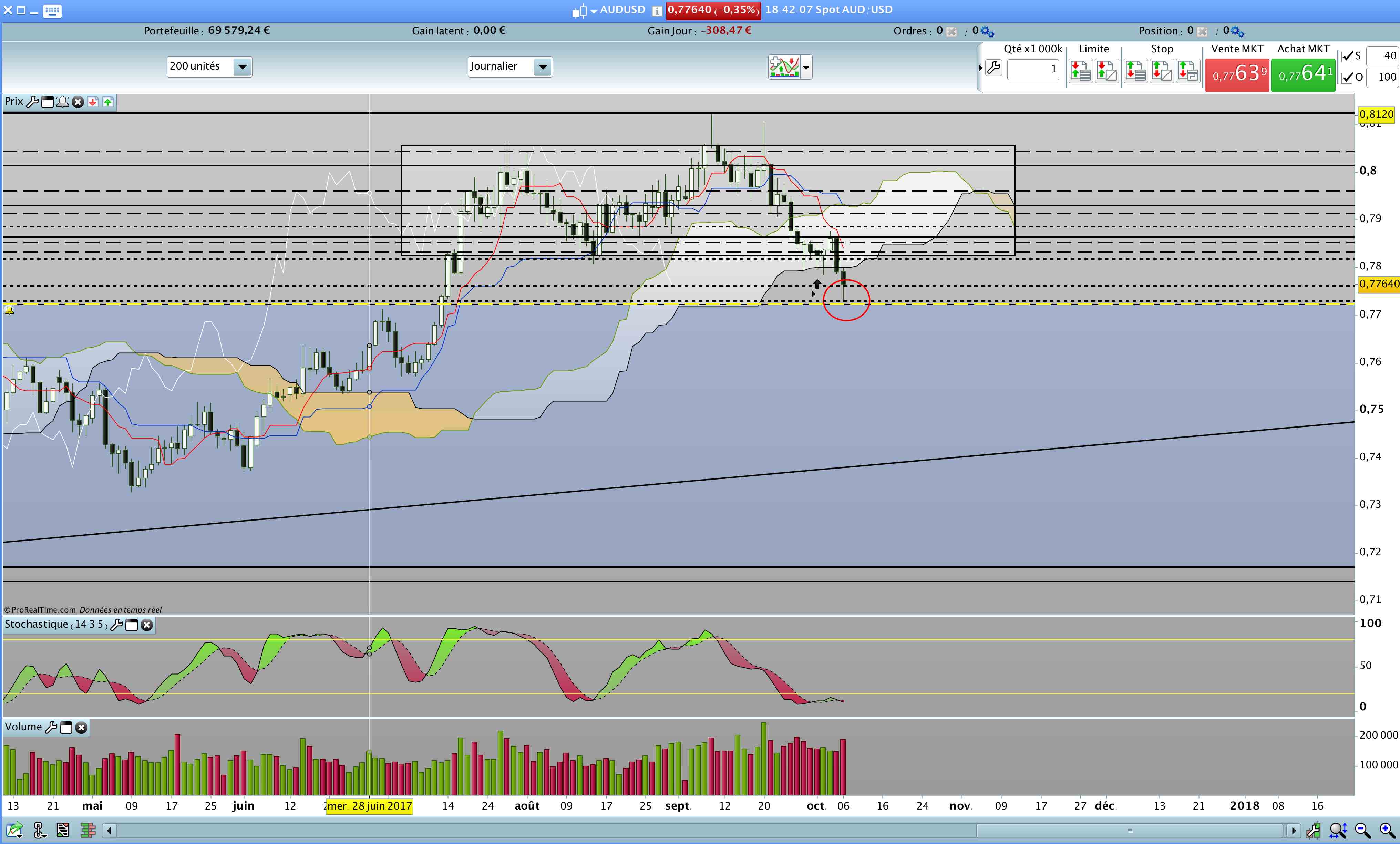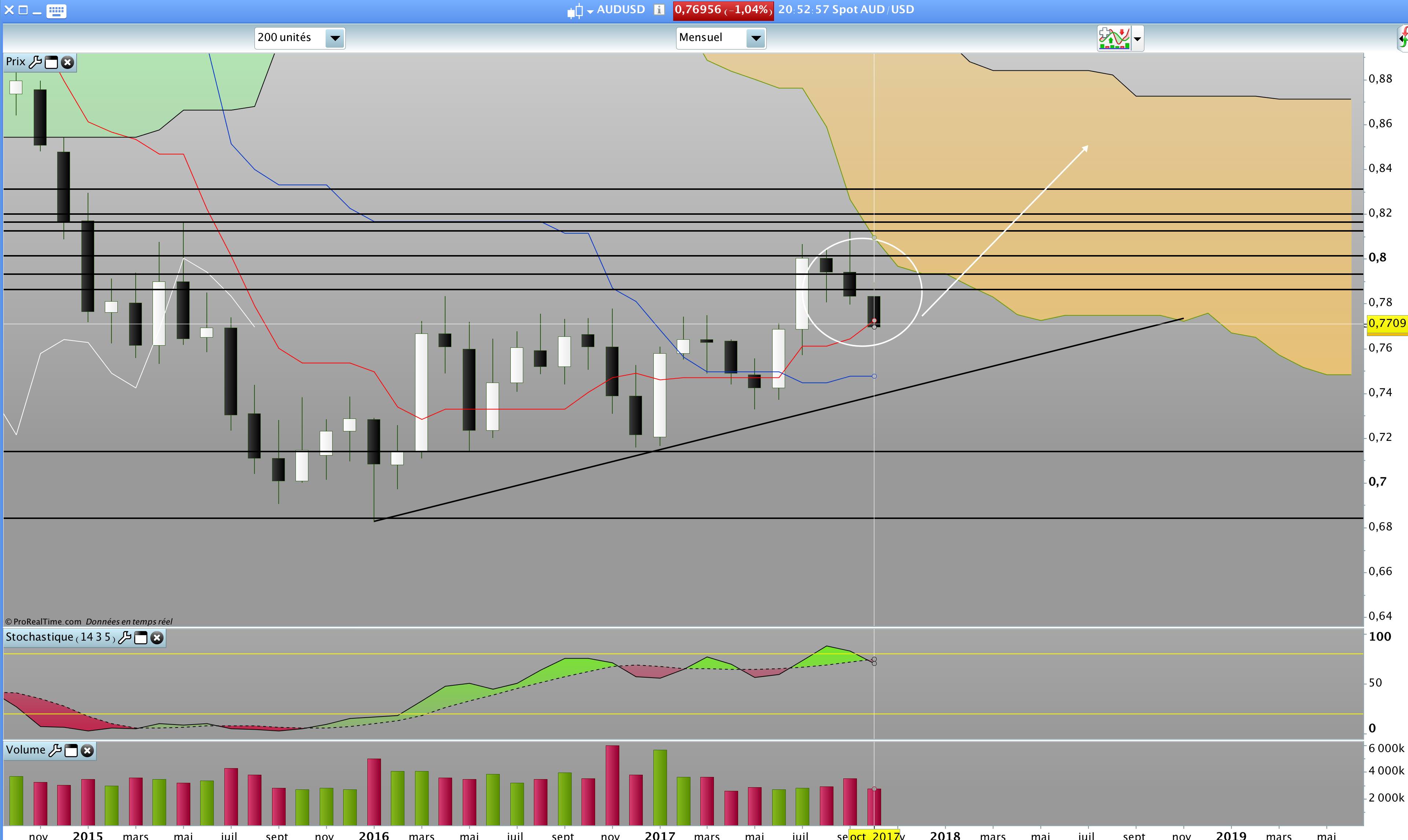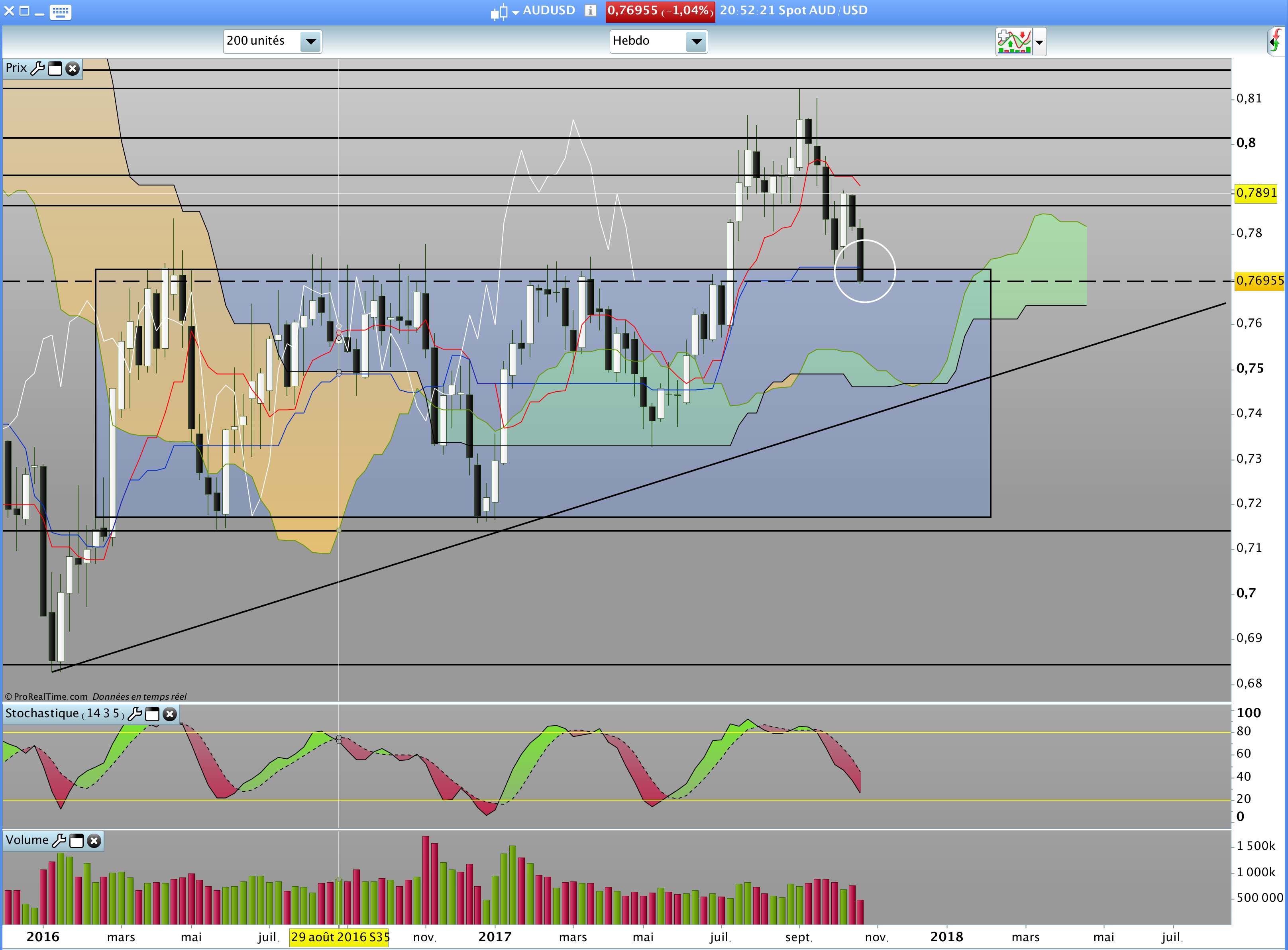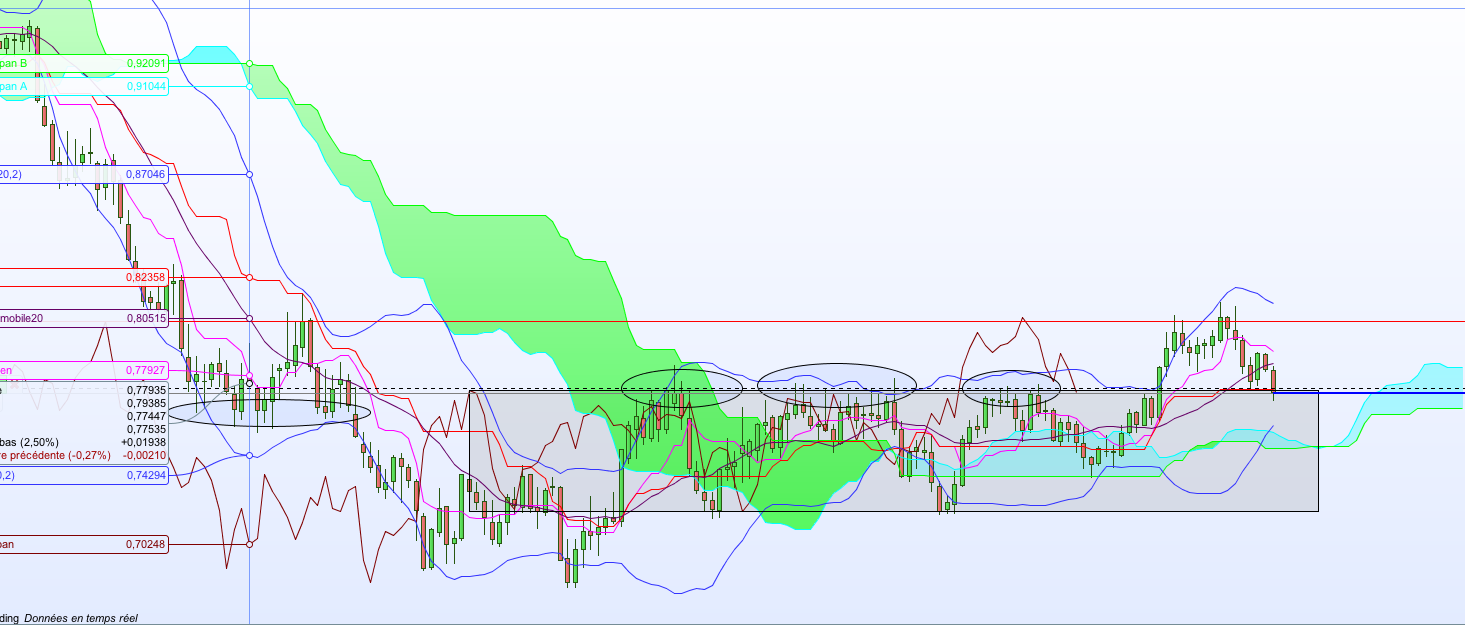 Si la bougie clôture dans le range, on ira à coup sur sur l'oblique hebdo vers les 0.75. Sinon, il faut attendre la fin de seamine pour savoir si on fait un ressort de la kijun weekly !