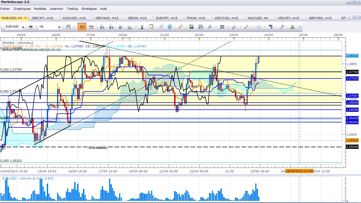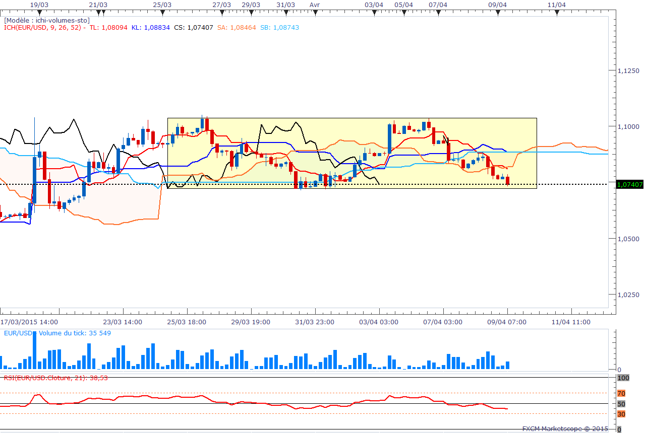 En H4, Support à 1.0750 qui correspond à une SSB et plat Kijun à gauche, cassé sur la bougie de 7h et retesté par la bougie suivante avec l'entrée des acheteurs mais ne réussissent pas à prendre la main donc clôture de bougie en dessous du support;