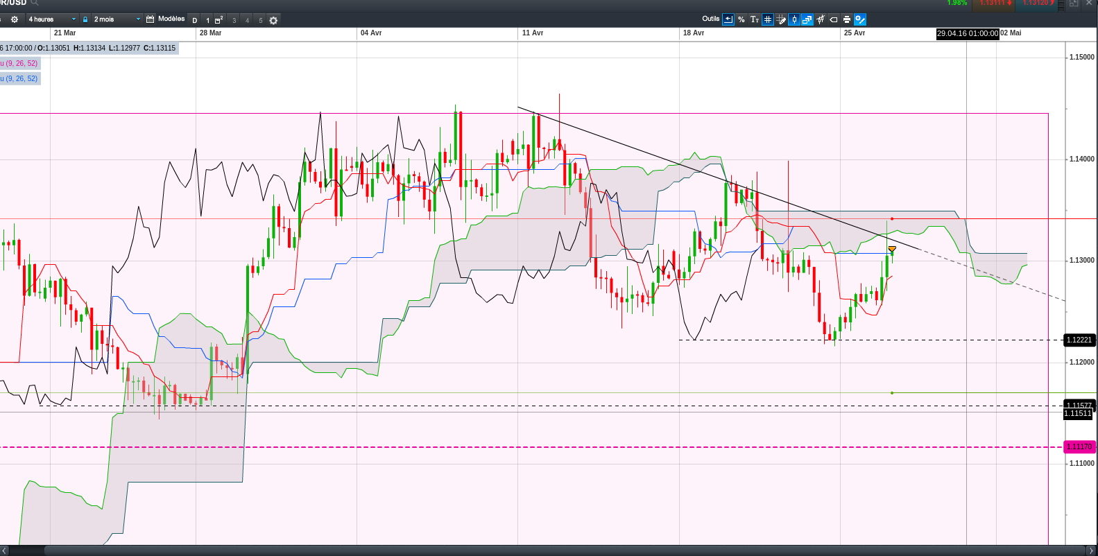 sur mon image, il faut voir si les prix vont s'appuyer sur kijun qui c'est typiquement couchée sur la borne haute ou le réintégrer