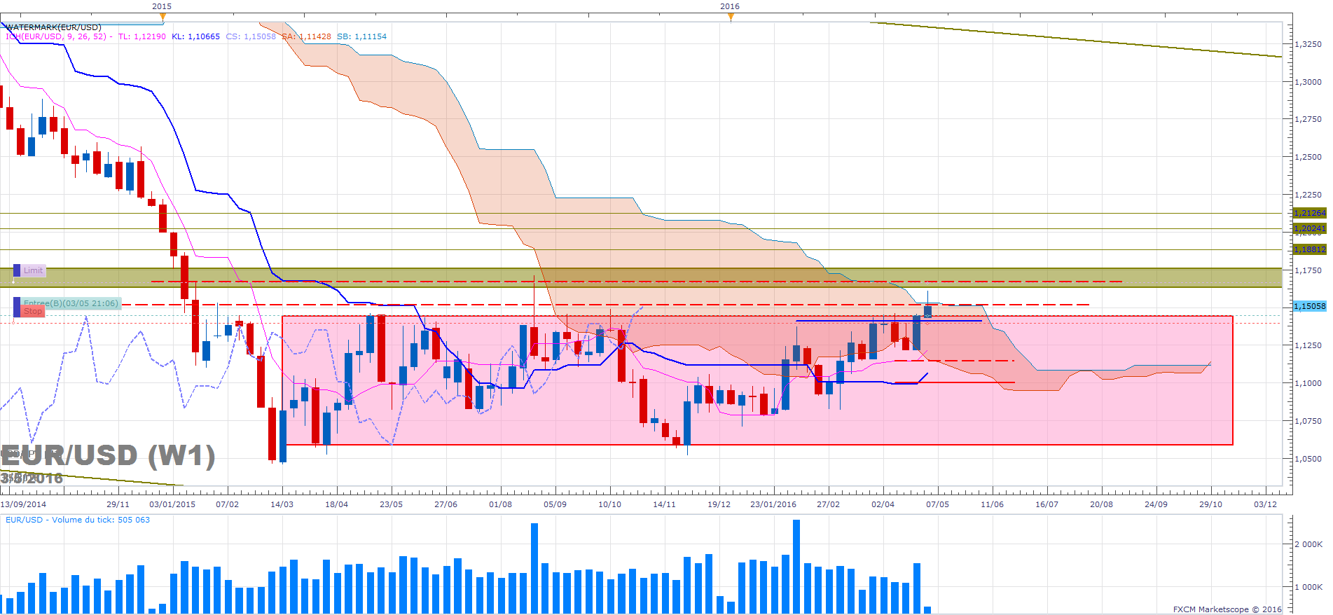En hebdo, la paire est en train de casser un range. Mais, pour entre être sur, il faut attendre la clôture de la bougie hebdo en cours... Et le problème est qu'en fin de semaine, le signal sera donné et les objectifs également atteint => train parti sans nous... donc !