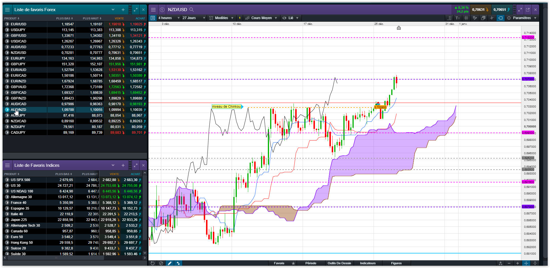 En journalier : en cette fin d'année, le marché a intégré une zone délimitée en grise, où il a évolué en rebondissant sur les 0.68. Il est sorti il y a quelques jours de cette zone et donc ce breakout haussier constitue un premier signal à exploiter. Signal confirmé par la Chikou qui a rebondi également sur l'oblique qui a été cassée. Je trace par la même occasion les plats de Kijun importants qui forment toujours des niveaux de TP/SL pertinents. On constate également qu'il y a eu un léger throwback après le breakout, avant que le marché ne tente de repartir à la hausse. La dernière bougie montre que les acheteurs ont été repoussés avec force par les vendeurs (longue mèche), cela invite à la prudence pour l'élaboration des stratégies. Je n'adhère pas à une certaine vision d'Ichimoku qui stipule que la présence des prix dans le nuage serait un signe de neutralité, j'ignore donc cette information.
