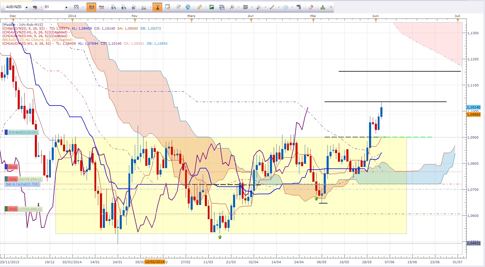 Soit on casse direct et on monte à 1.115 soit on reste sous résistance avec un possible range entre 1.09 et 1.1035 le temps de laisser remonter un peu kijun daily.