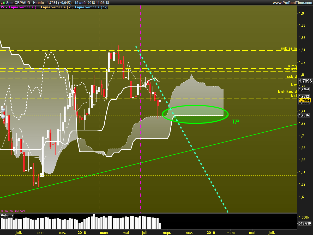 hebdo: kumo haussier mais les prix sont repassé sous la kijun. On note le prochain support fort avec cette SSB future en extension (ellipse verte). Le chandelier de la semaine dernière tendrait à penser à une remontée des prix, mais je privilégie les infos de l'UT supérieure, donc j'opte pour du short.