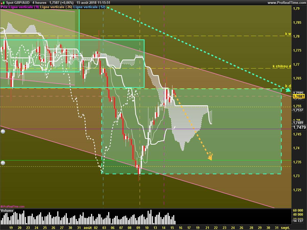 suivi de l'analyse: le range daily a bien cédé par le bas mais les prix ont réintégré le range après avoir rebondi sur un support (ligne jaune). Attention: les prix sont actuellement passé au-dessus de la kijun hebdo. Pour envisager d'entrer short, il faudra bien s'assurer que tous ces supports seront cassés.
