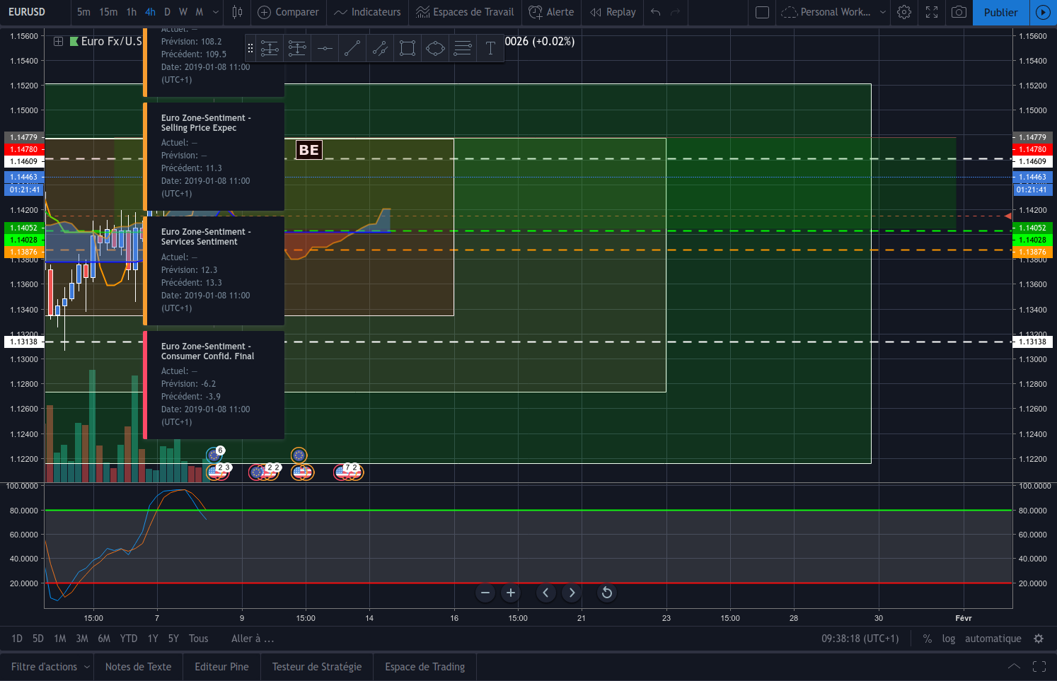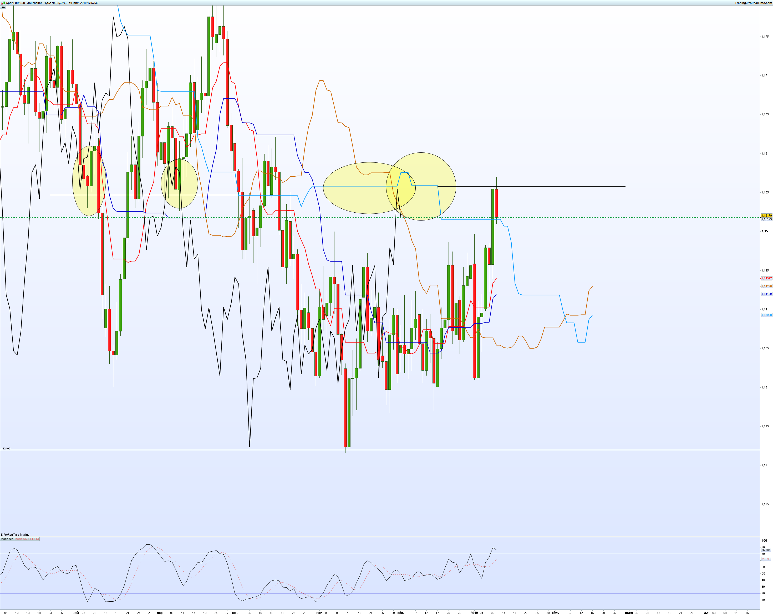 bonjour les amis j'attends toujours le pullback qui sera mon point d'entrée. Ce pullback peut se situer sur 1.1516 ( médiane du grand range) ou même sur 1.1440 départ du rebond précédent ( élipse verte) Il faut tenir compte du fait que chikou n'a toujours pas traversé le nuage en D1 (élipse jaune). donc patience ... si je trouve un point d'entrée mes objectifs seront 1.1620, 1.1680, 1.1800, 1.1964