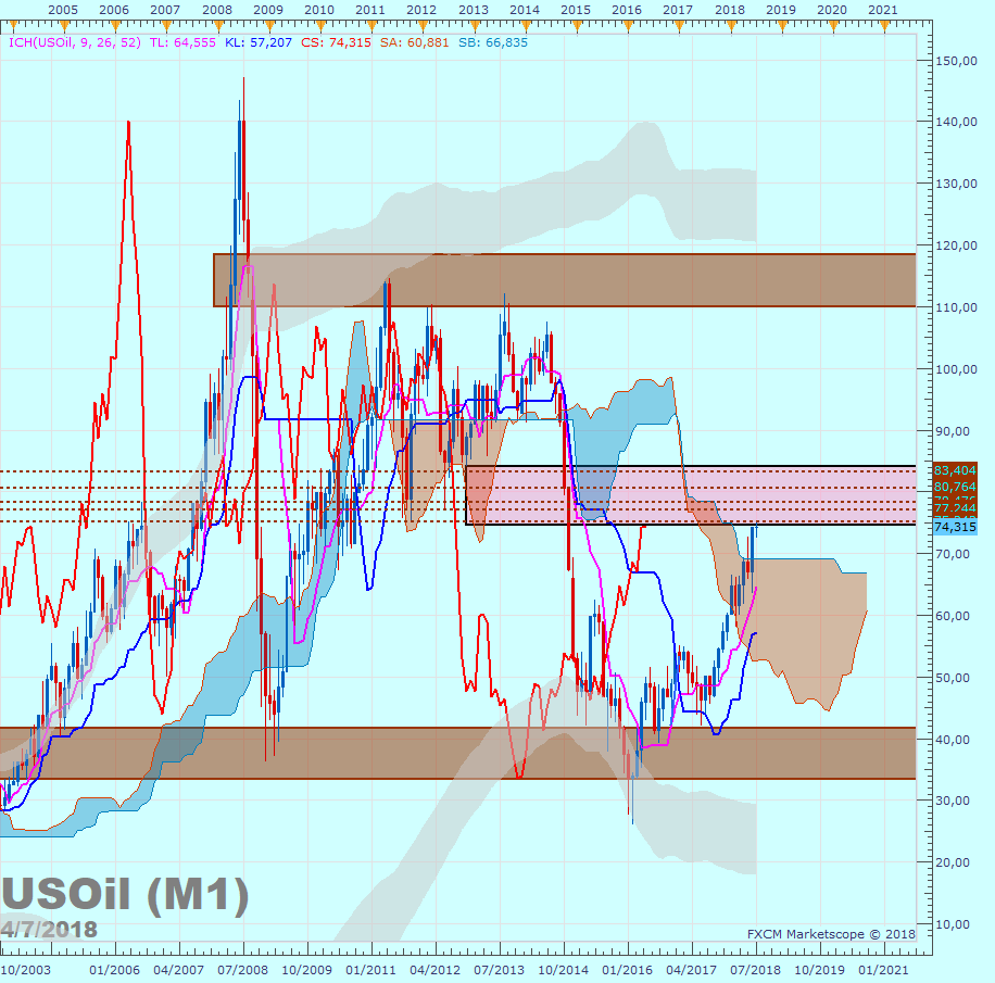 CCL : je ne vais pas jouer avec des ranges H1, c'est inutile et dangereux. Mais à l'apparition d'un range H4 au pire, daily au mieux m'intéresse et je vendrais la borne haute sans grande hésitation. Si ca repart à la hausse parce que la zone de short mensuelle est très très large, ce n'est pas grave car le ratio est excellent. On peut voir différents TP, à commencer par les 67.5, puis les 65, 58.6... on peut aller jusqu'à 40 comme ça ! Ou pas !! Il faudra probablement s'y prendre plusieurs fois... C'est pourquoi ce genre de trade et de sous-jacent sont difficiles à mettre en oeuvre et à piloter. Ils demandent un peu de sang froid.