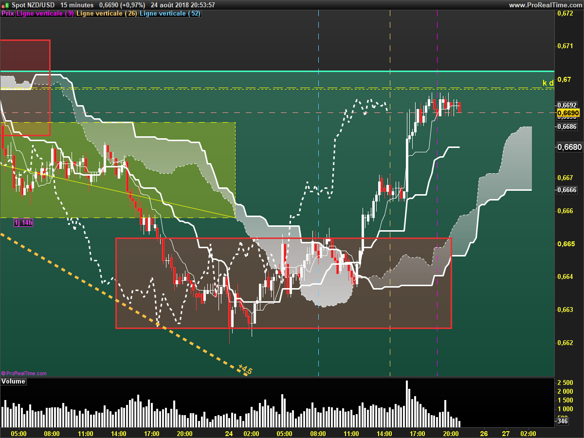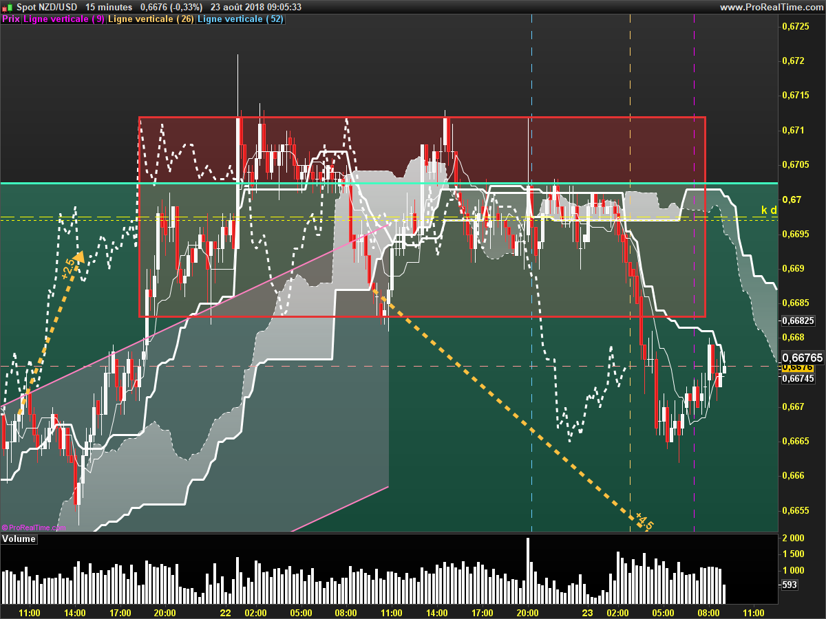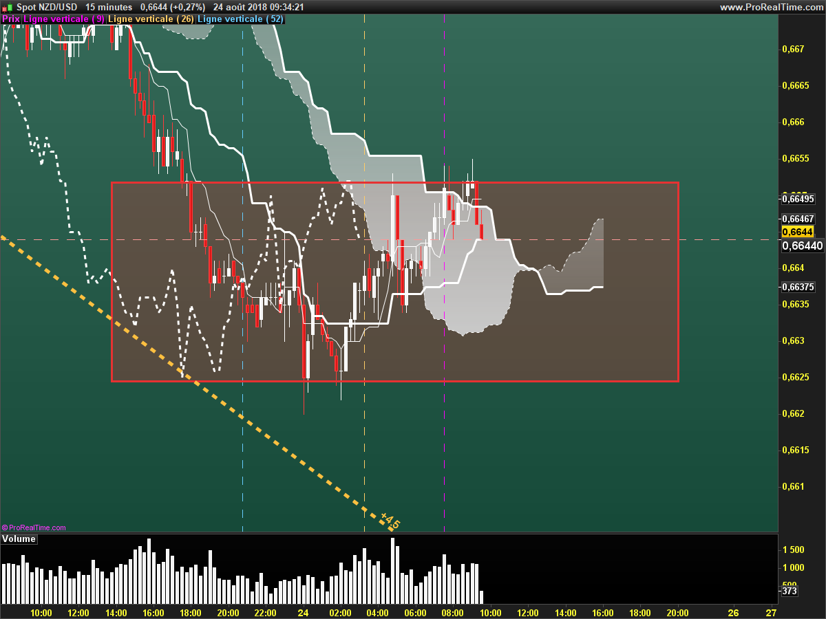 m15: ce pullback a donc créé un range en m15 dont la borne haute correspond à la kijun H1. Chandeliers de retournement en haut de ce range (et donc sur la kijun H1)